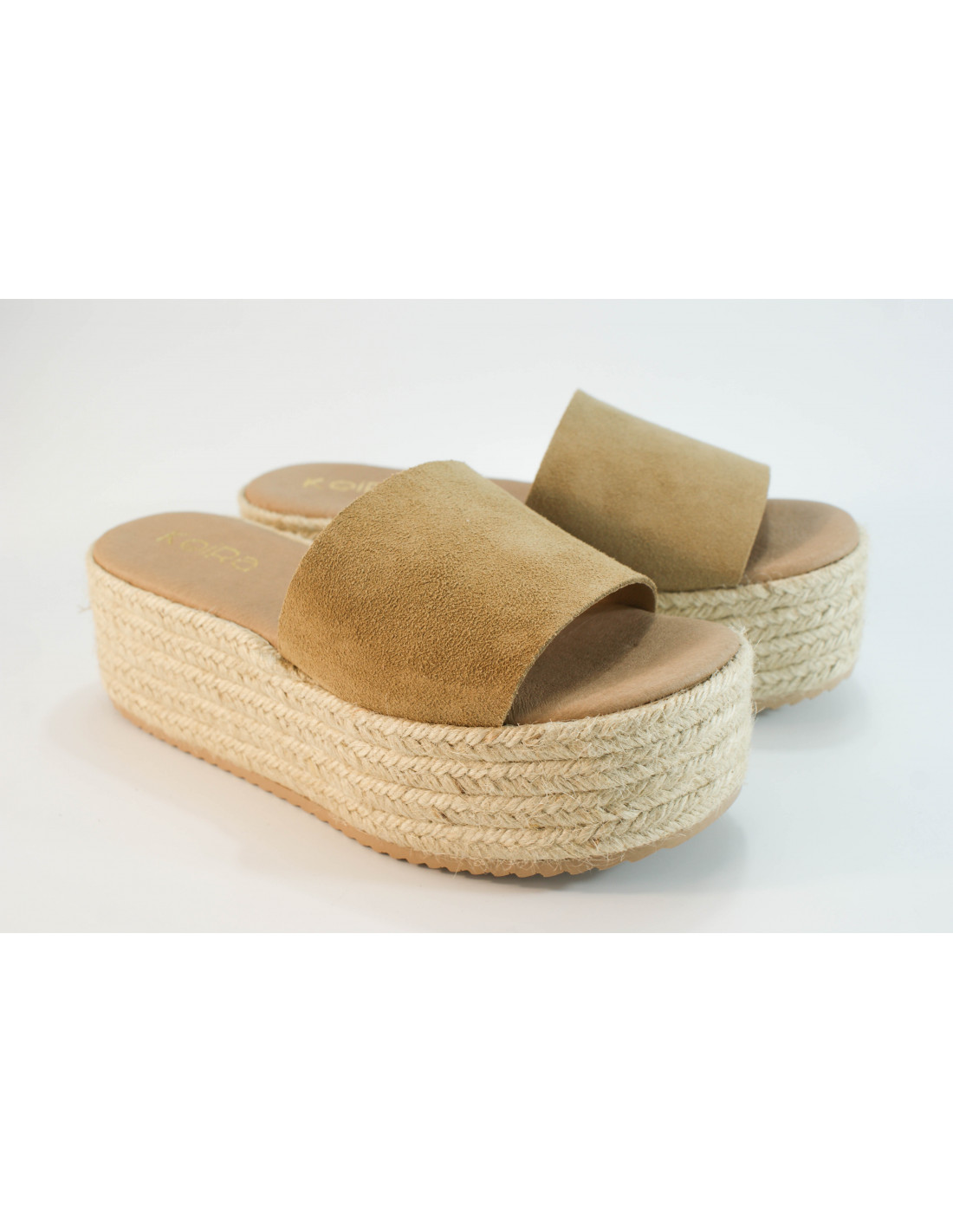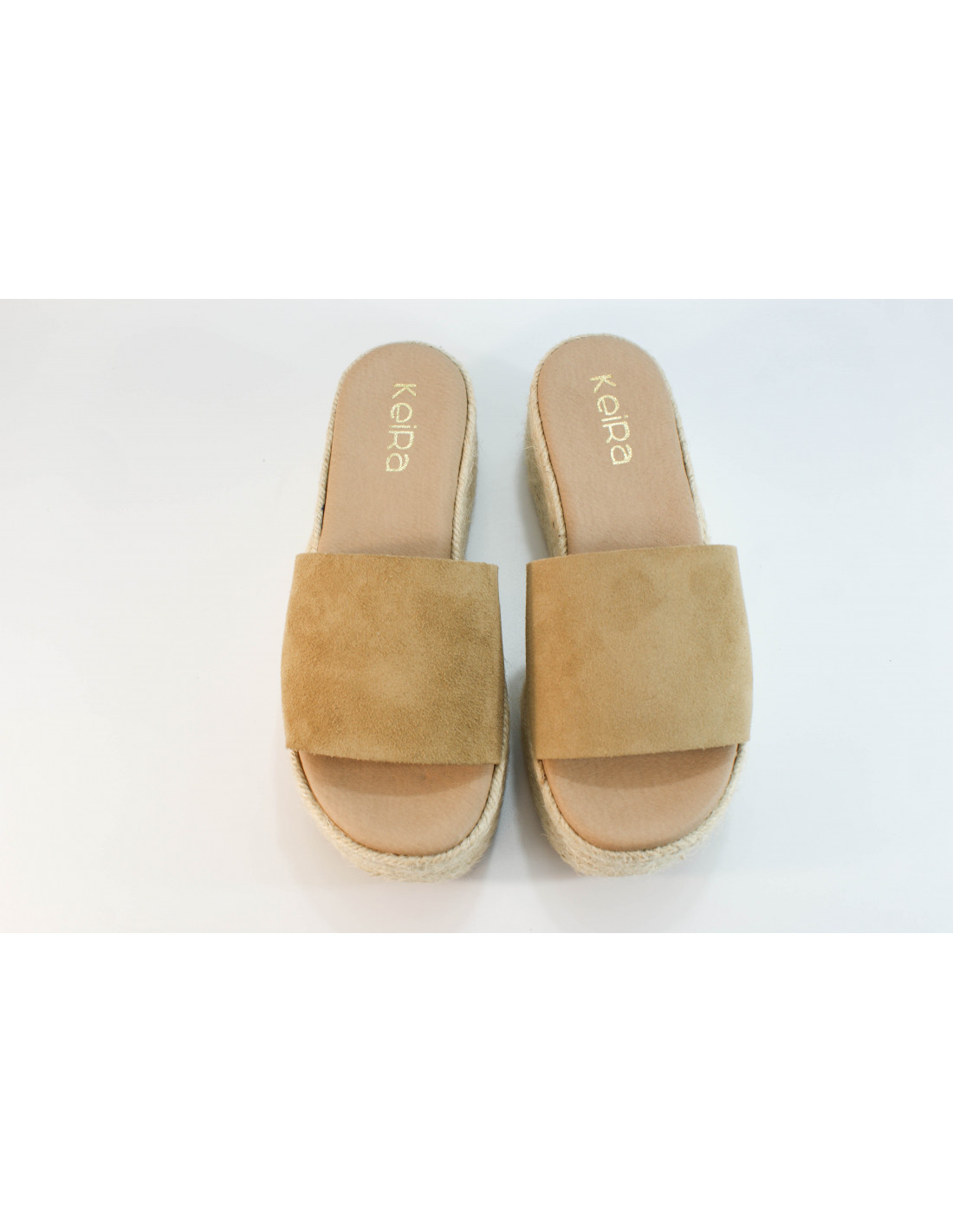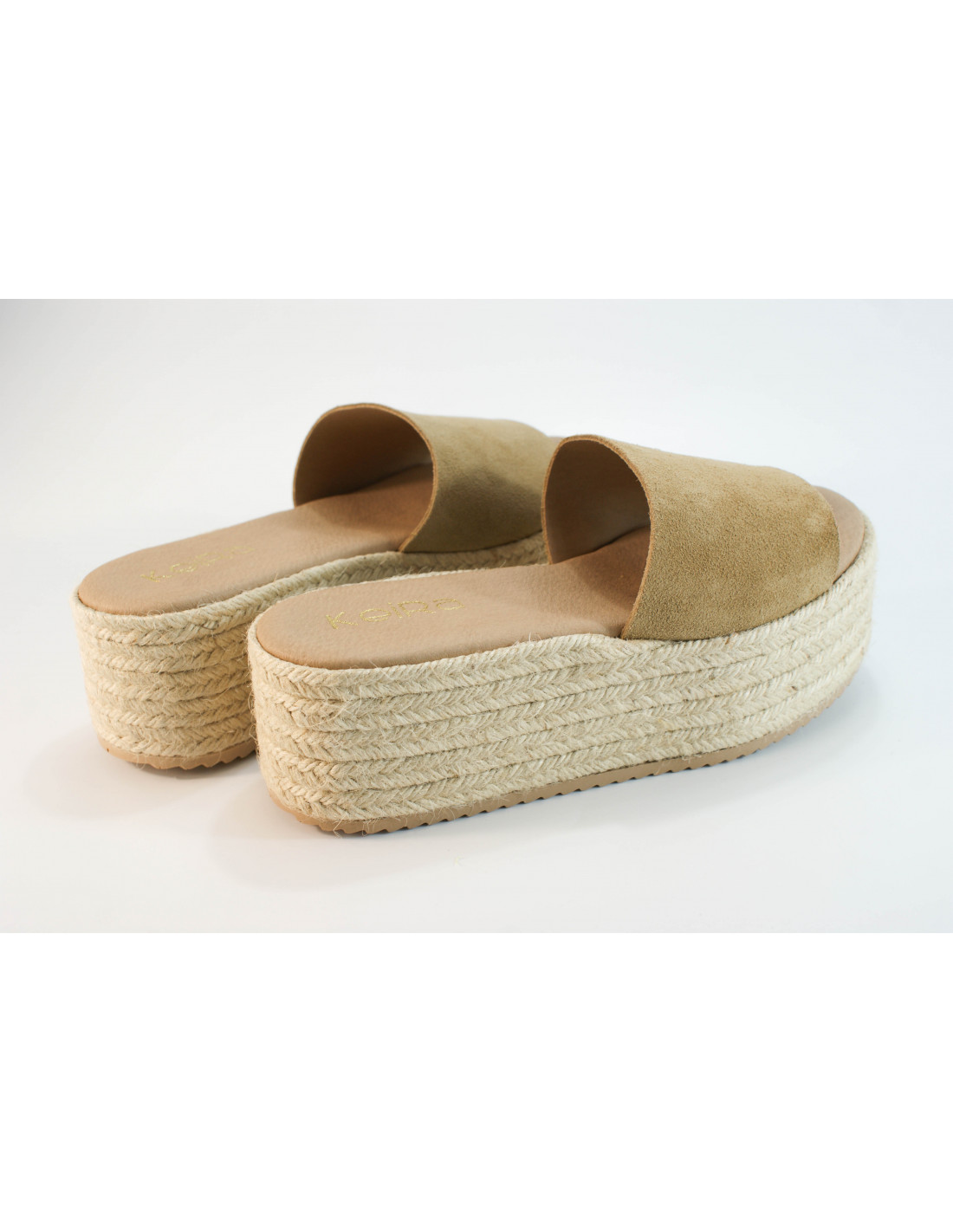 5-Saiter-Plattform von 6 cm. hoch, aus beigem Wildleder, gepolsterte Lederinnensohle und Gummisohle.