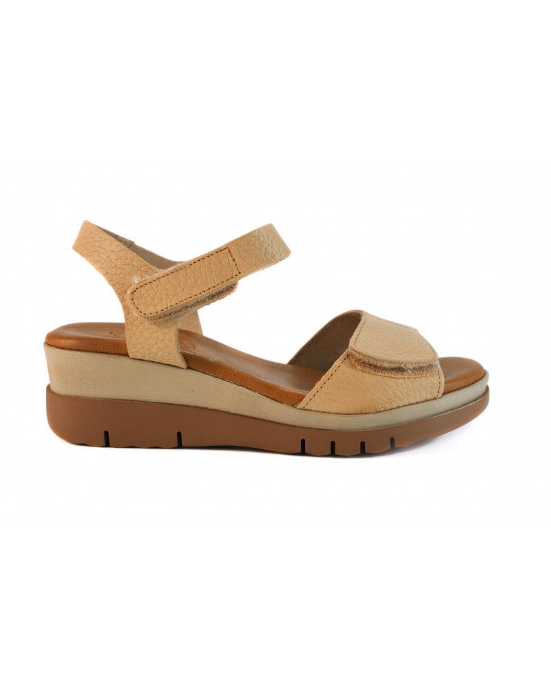 Sandfarbene Ledersandale mit Klettverschluss am Spann. Leichte 5 cm hohe Polyurethansohle und 2 cm Plateau. Gepolsterte Innensohle aus Leder.
