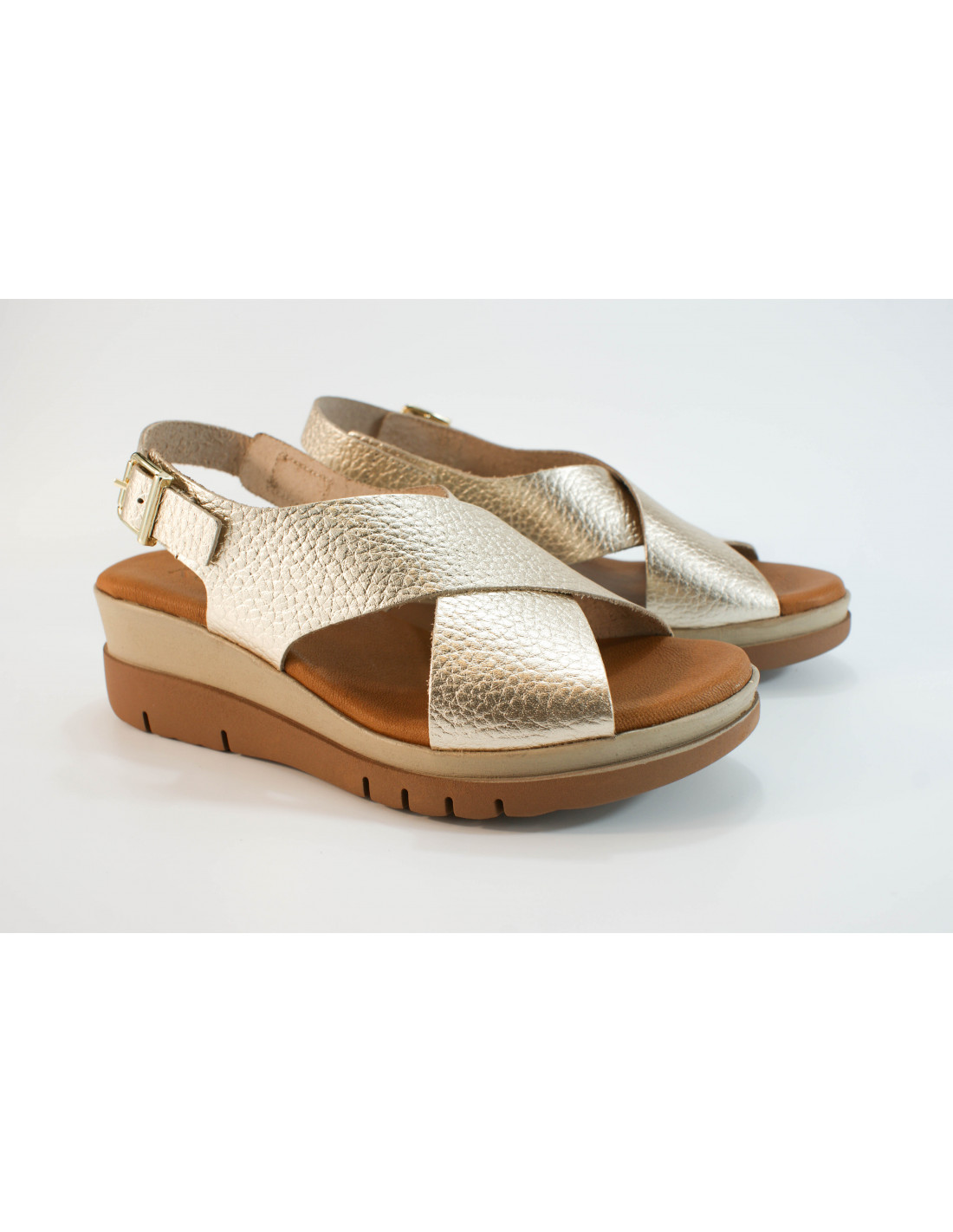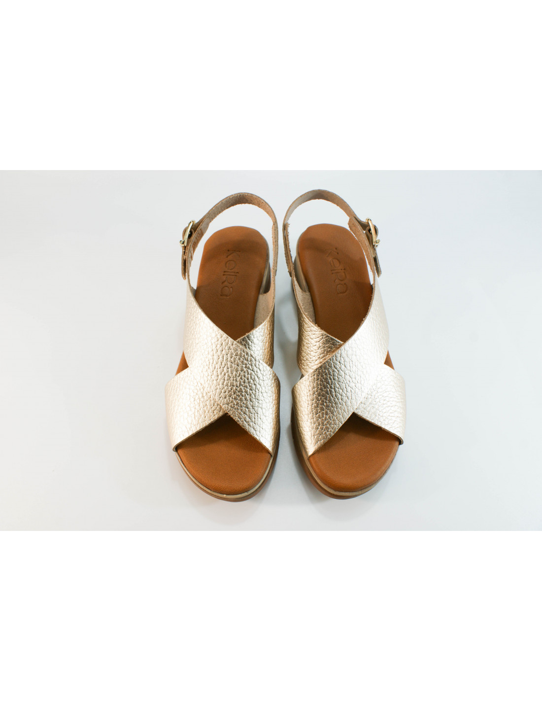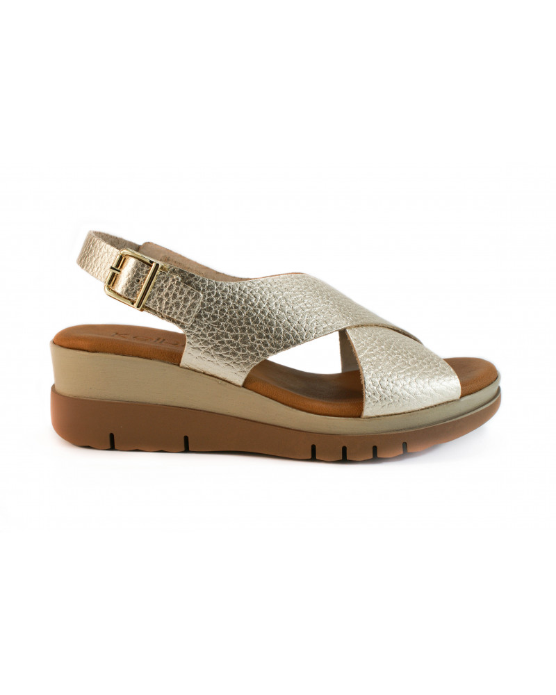 Sandale aus platinmetallischem Leder mit Schnallenverschluss auf der Rückseite. Leichte 5 cm hohe Polyurethansohle und 2 cm hohes Plateau. Gepolsterte Innensohle aus Leder.