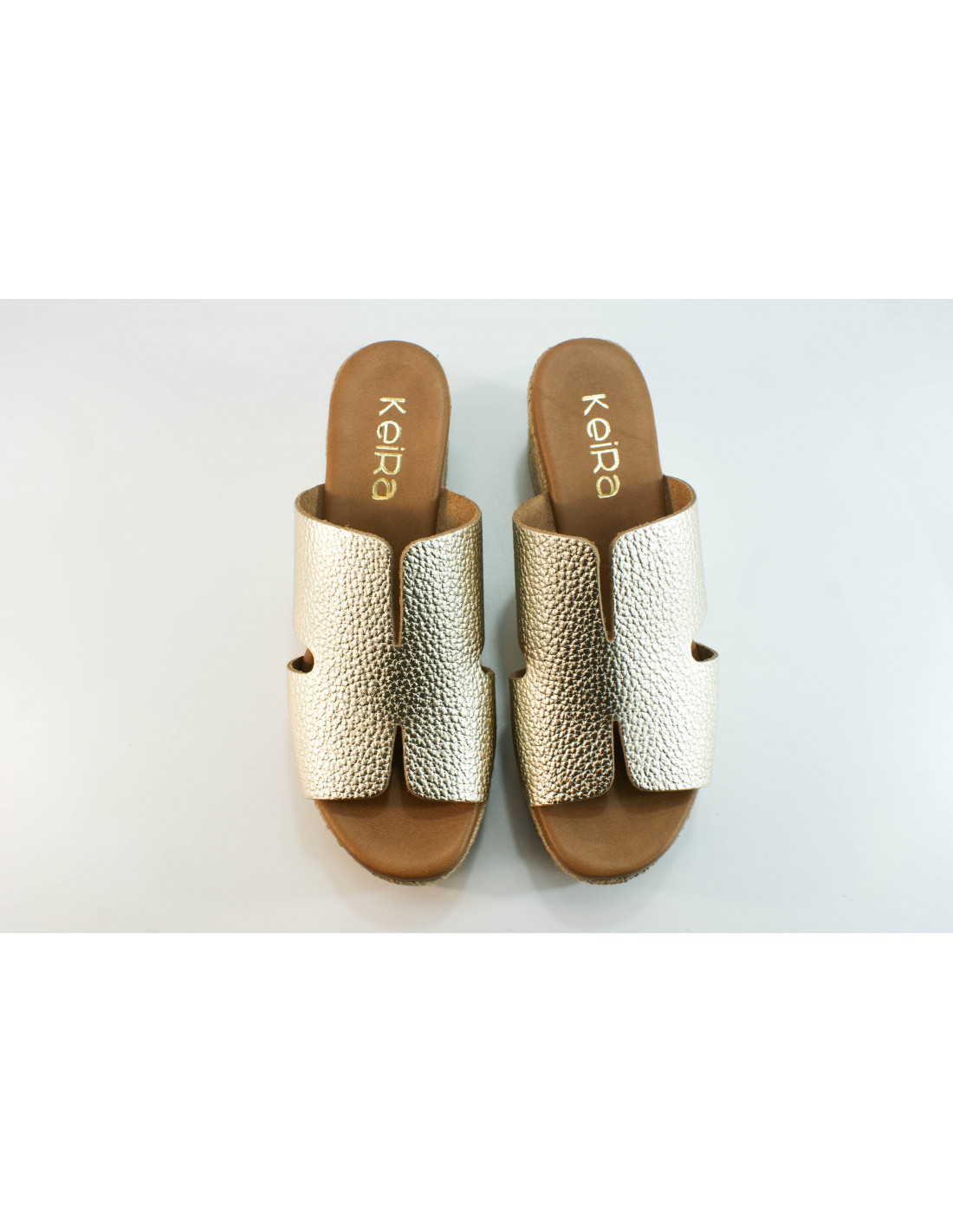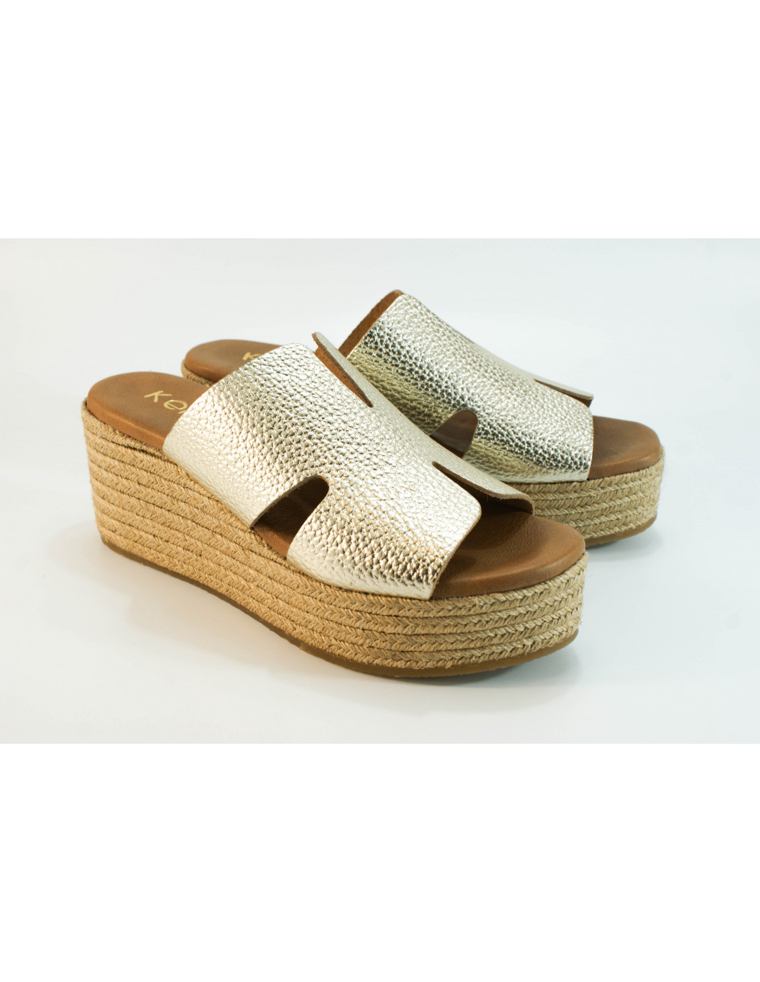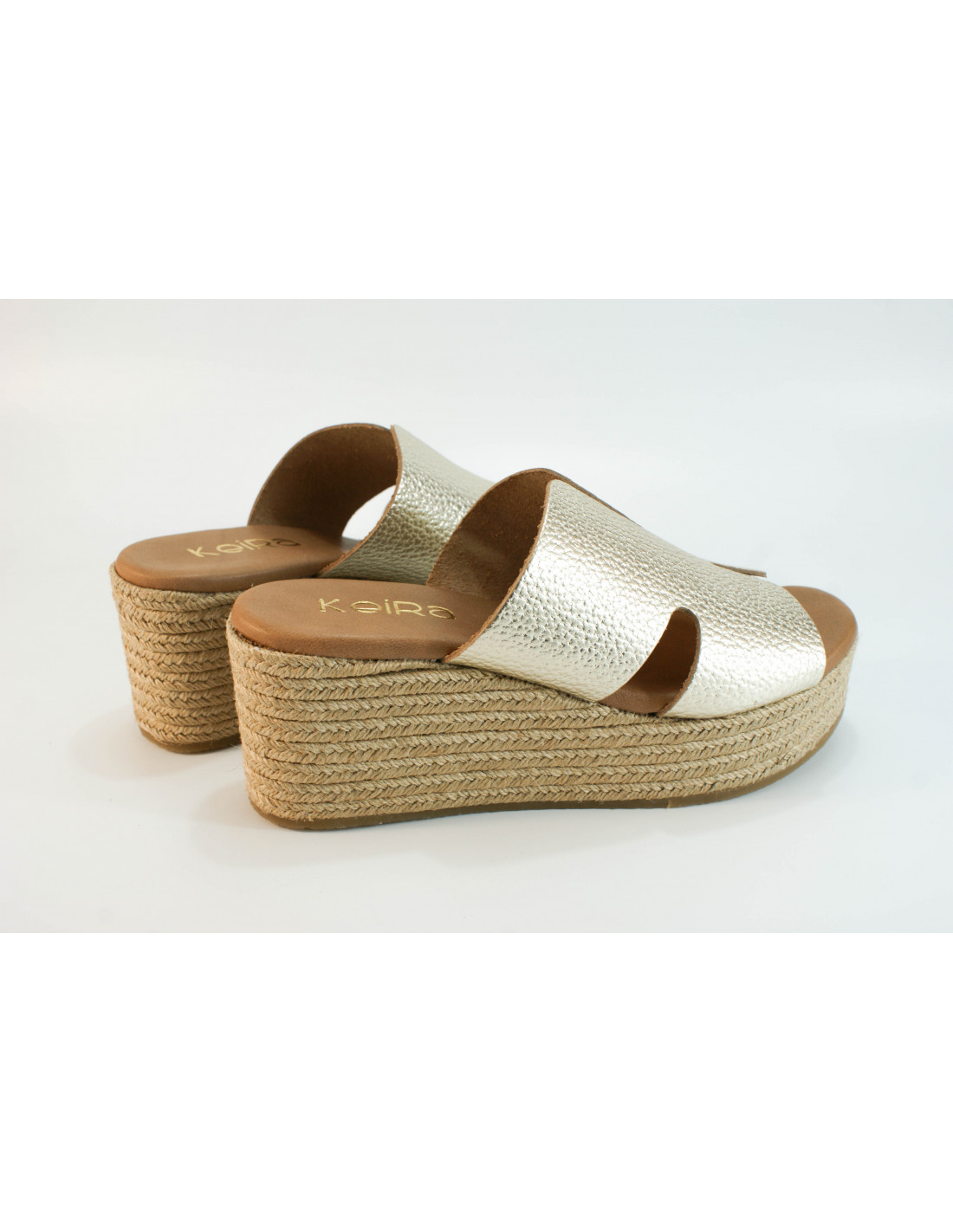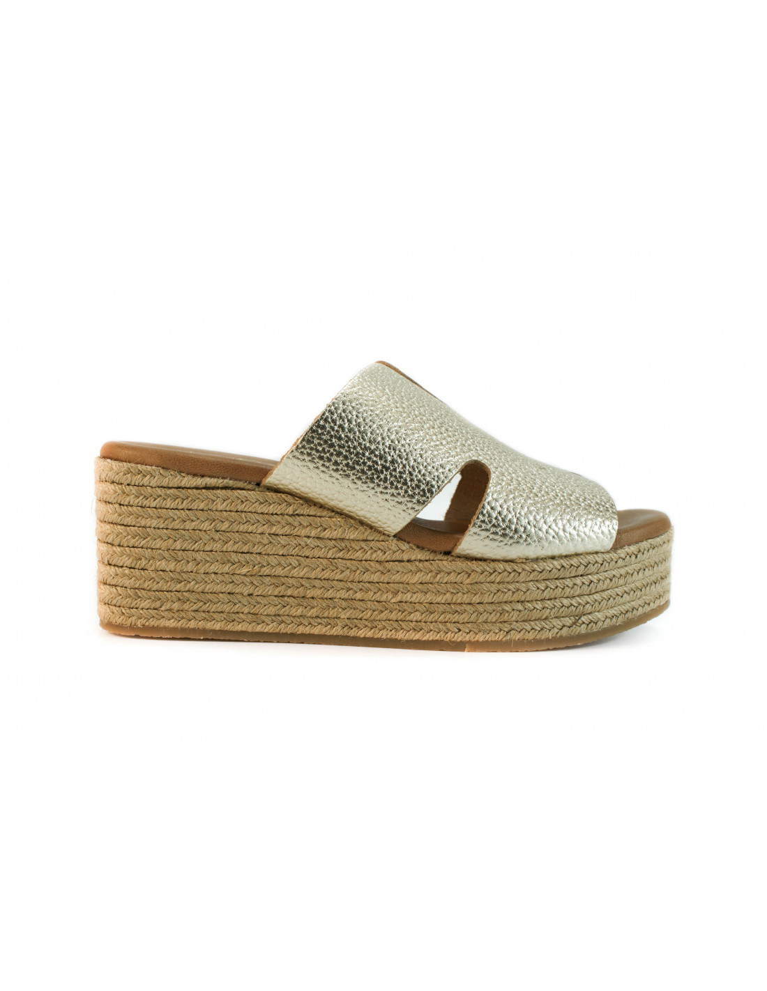 Sandale mit Plateausohle aus 8 Espartogras-Seilen. Aus platinmetallischem Leder. Gepolsterte Innensohle aus Leder.