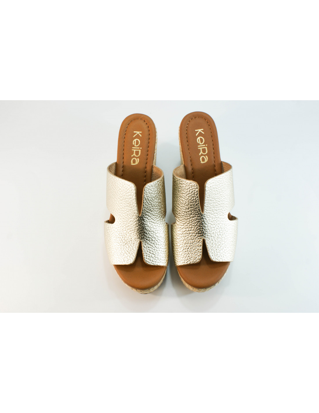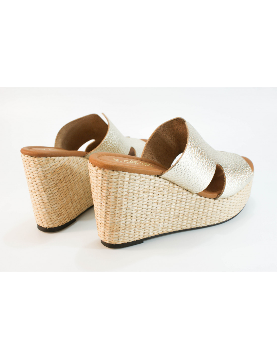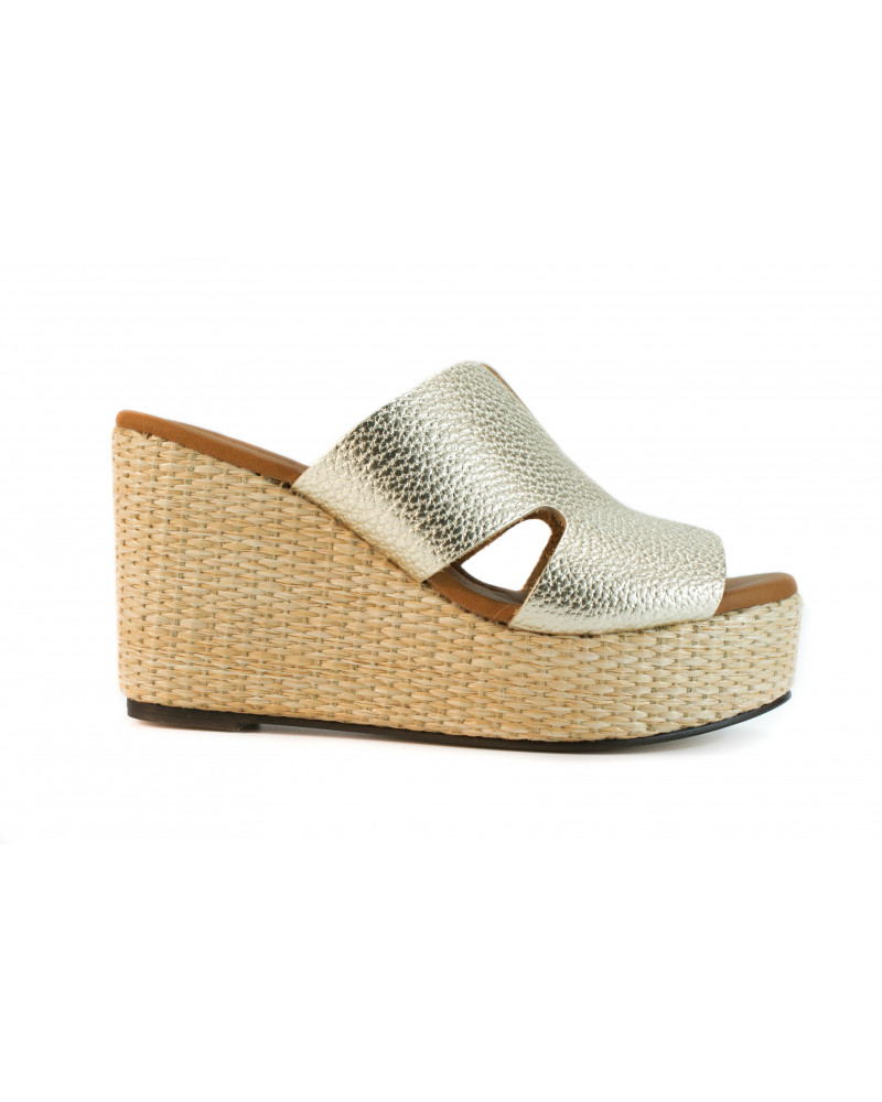 Sandale mit 10 cm hohem Plateau aus natürlichem Bast. hoch. Aus platinmetallischem Leder. Gepolsterte Innensohle aus Leder.