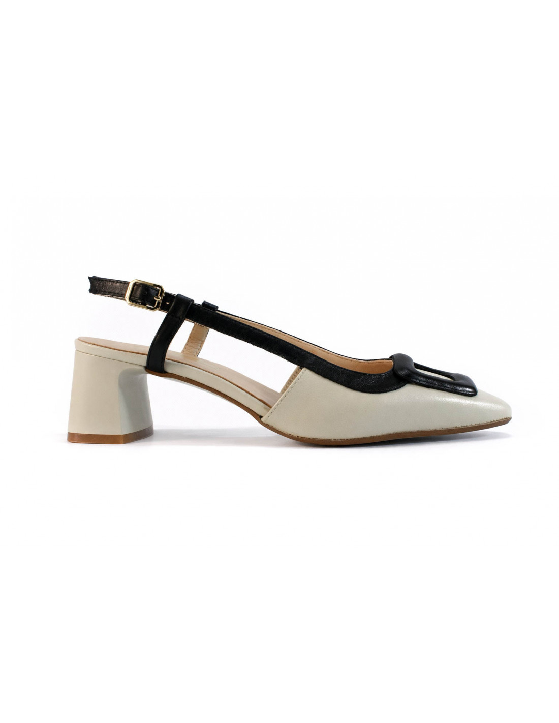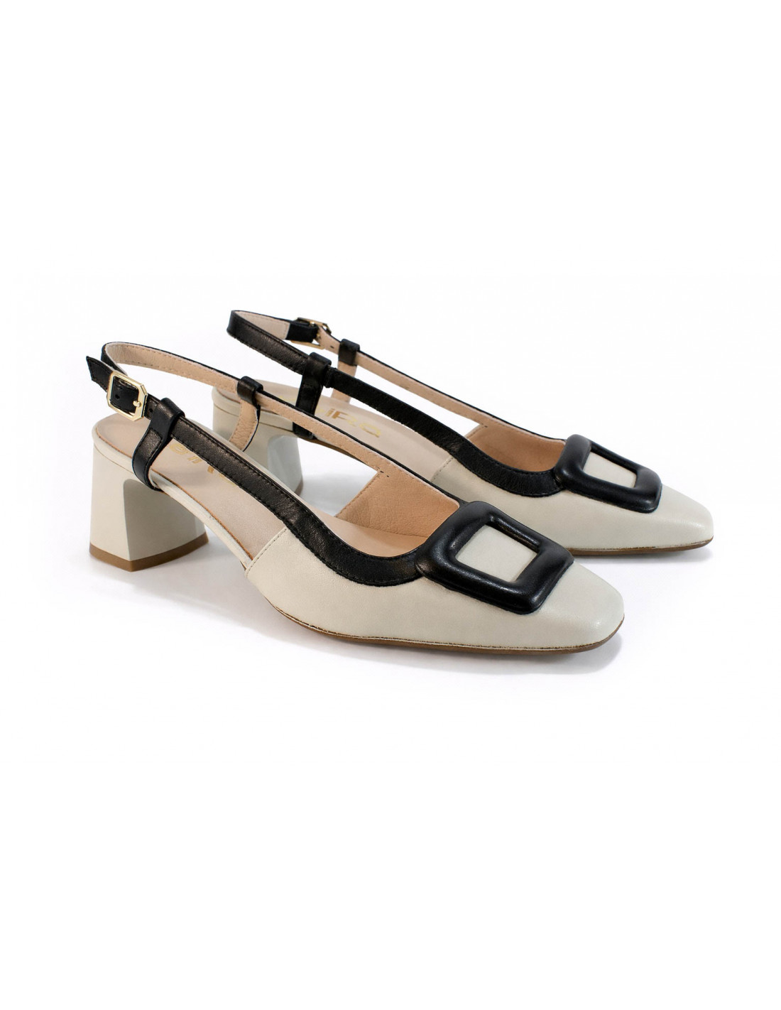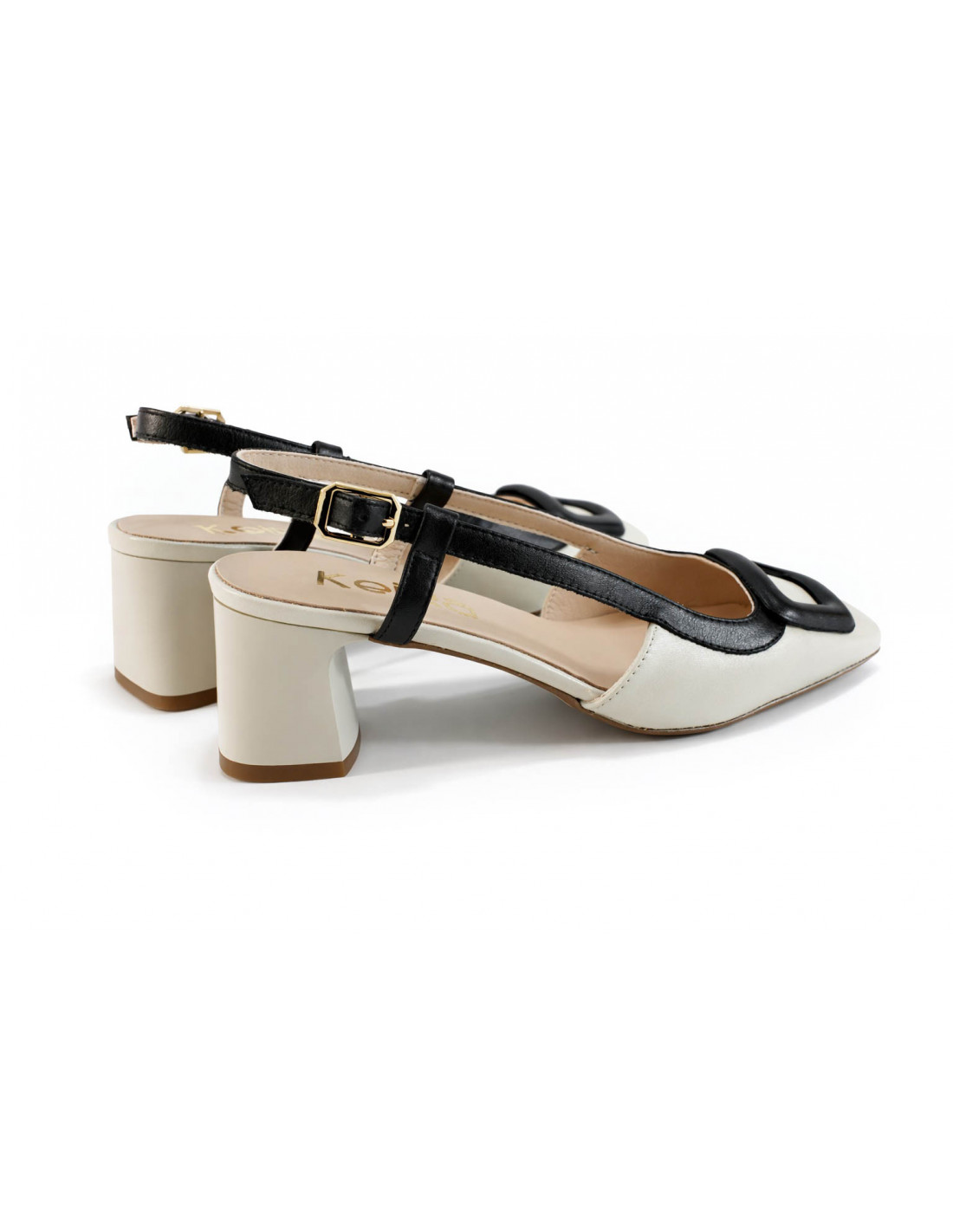 Dieser Lederpumps mit Fersenriemen vereint Eleganz und Komfort in einem modernen Design. Er ist zweifarbig gestaltet und besticht durch eine helle Basis mit schwarzen Details. Absatzhöhe: 6 cm.