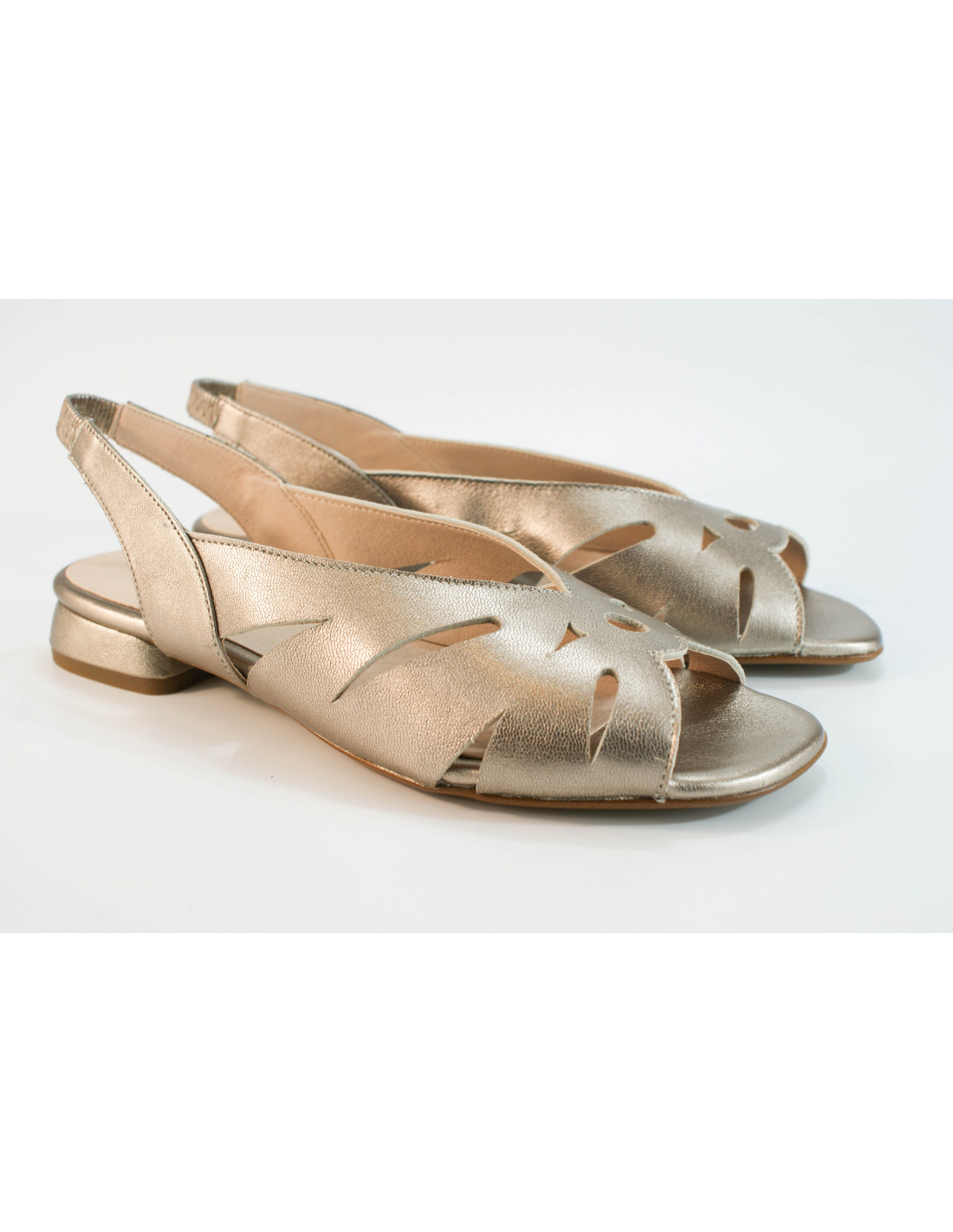 Sandale aus rostfarbenem Metallicleder. Rückengurt mit Gummizug für eine perfekte Passform. Futter und Innensohle aus Leder. 3 cm Absatz.