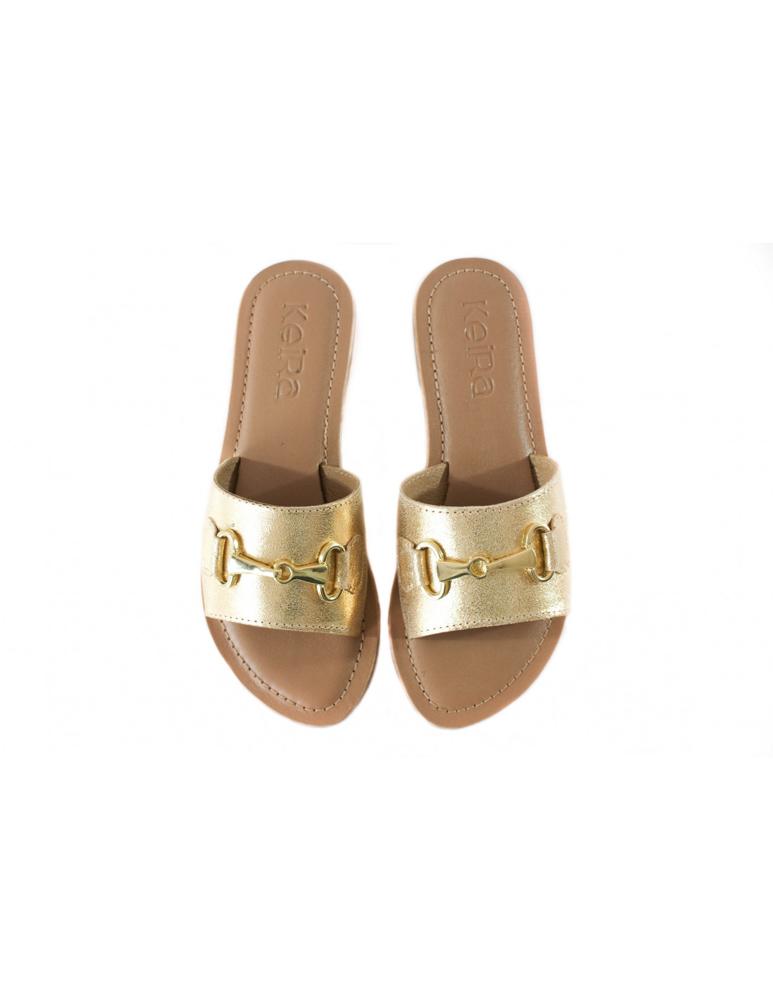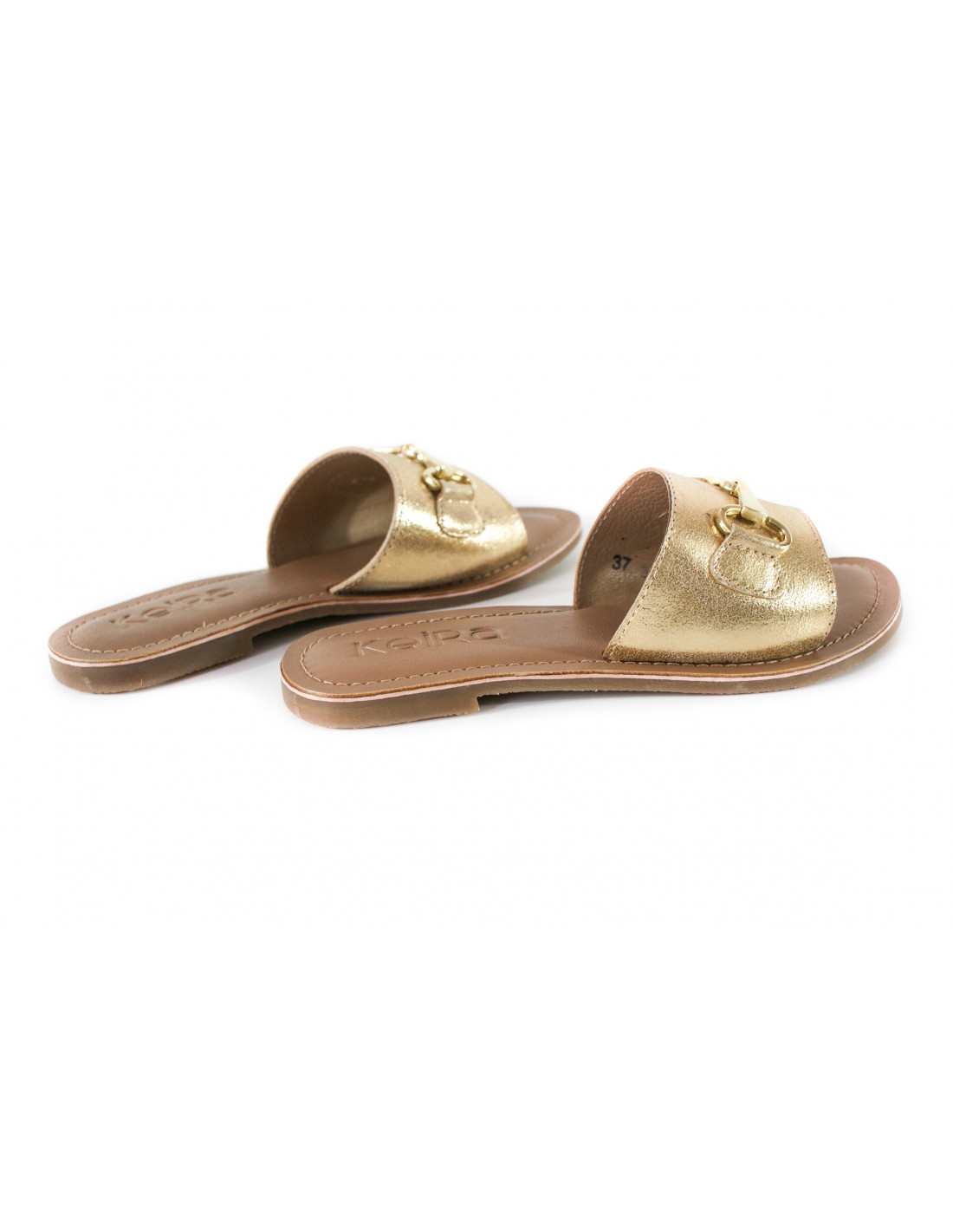 Flache Sandale aus goldfarbenem Metallic-Leder mit Metallverzierung. Gummisohle.