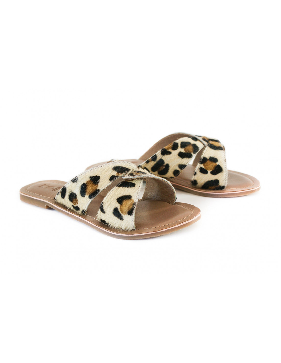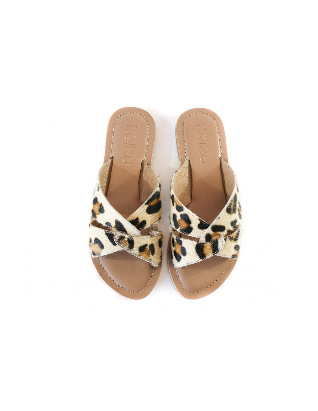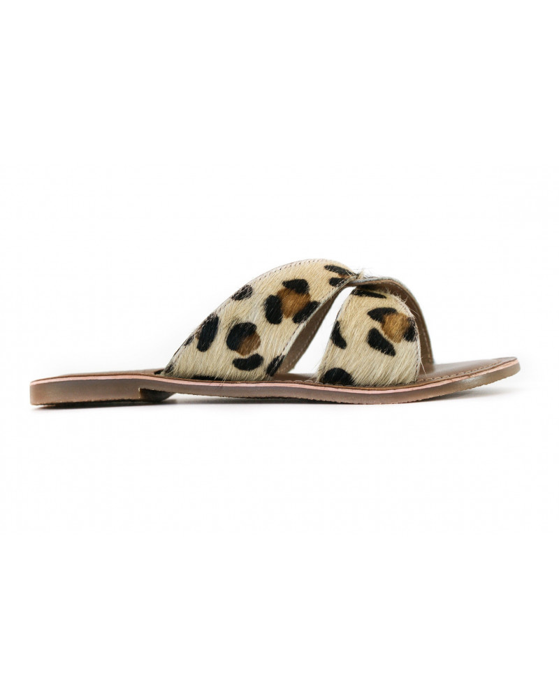 Flache Sandale mit Pony-Leopardenimitat. Gummisohle.