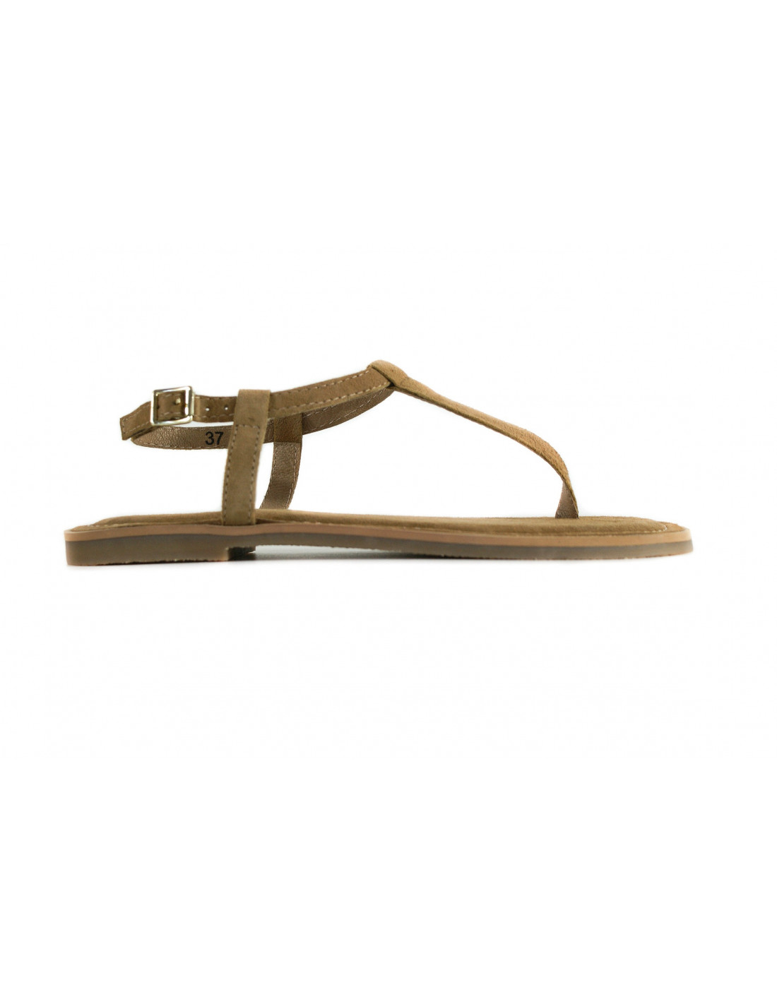 Einfache flache Sandale aus beigem Wildleder, gepolsterter Lederdecksohle und Gummisohle.