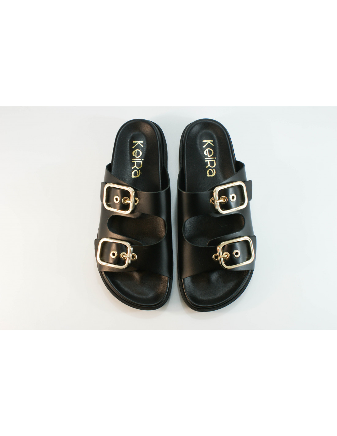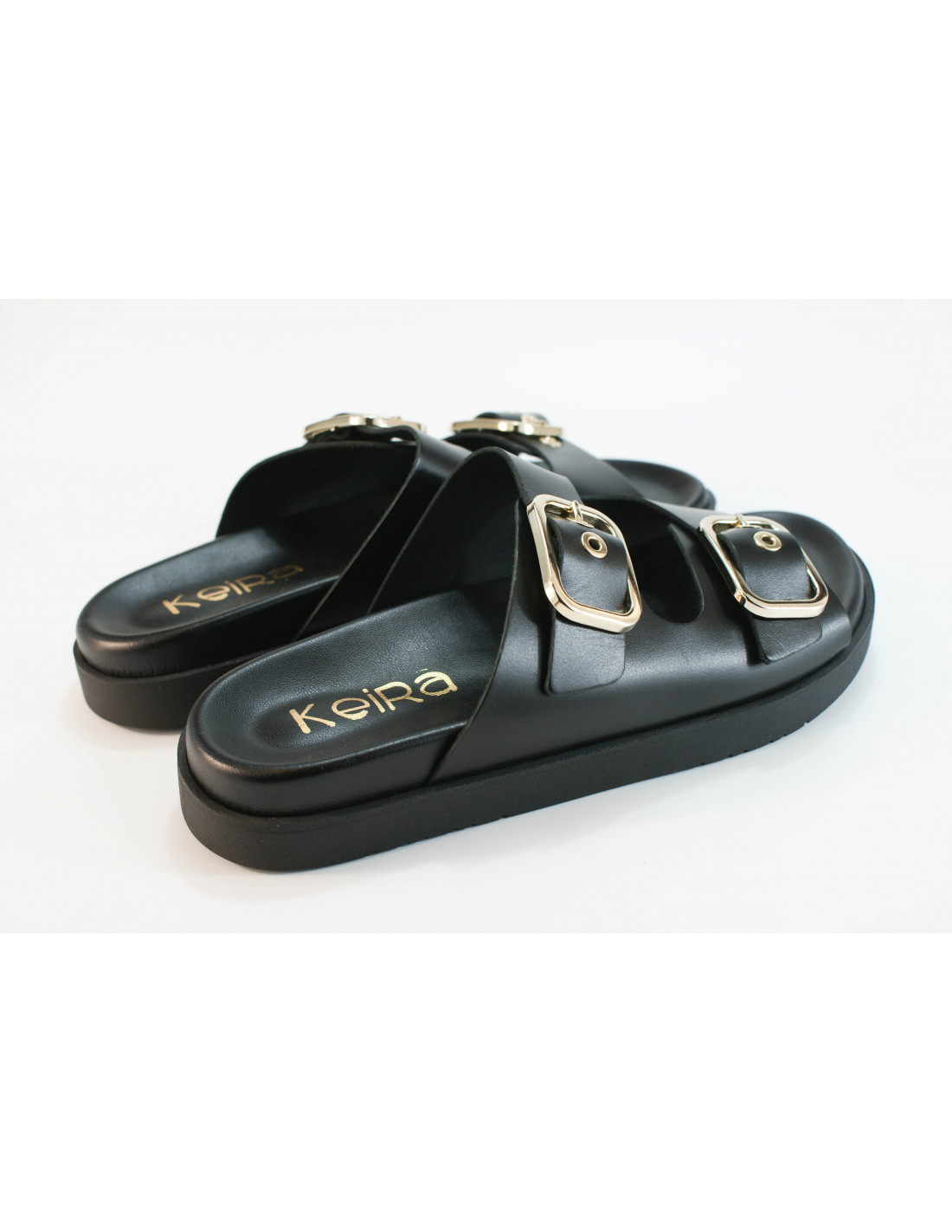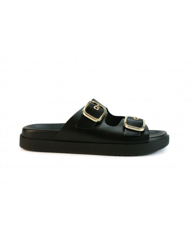 Sandalia bio de piel con hebillas metálicas doradas. Plantilla forrada y suela de goma de 3 cms. de altura.