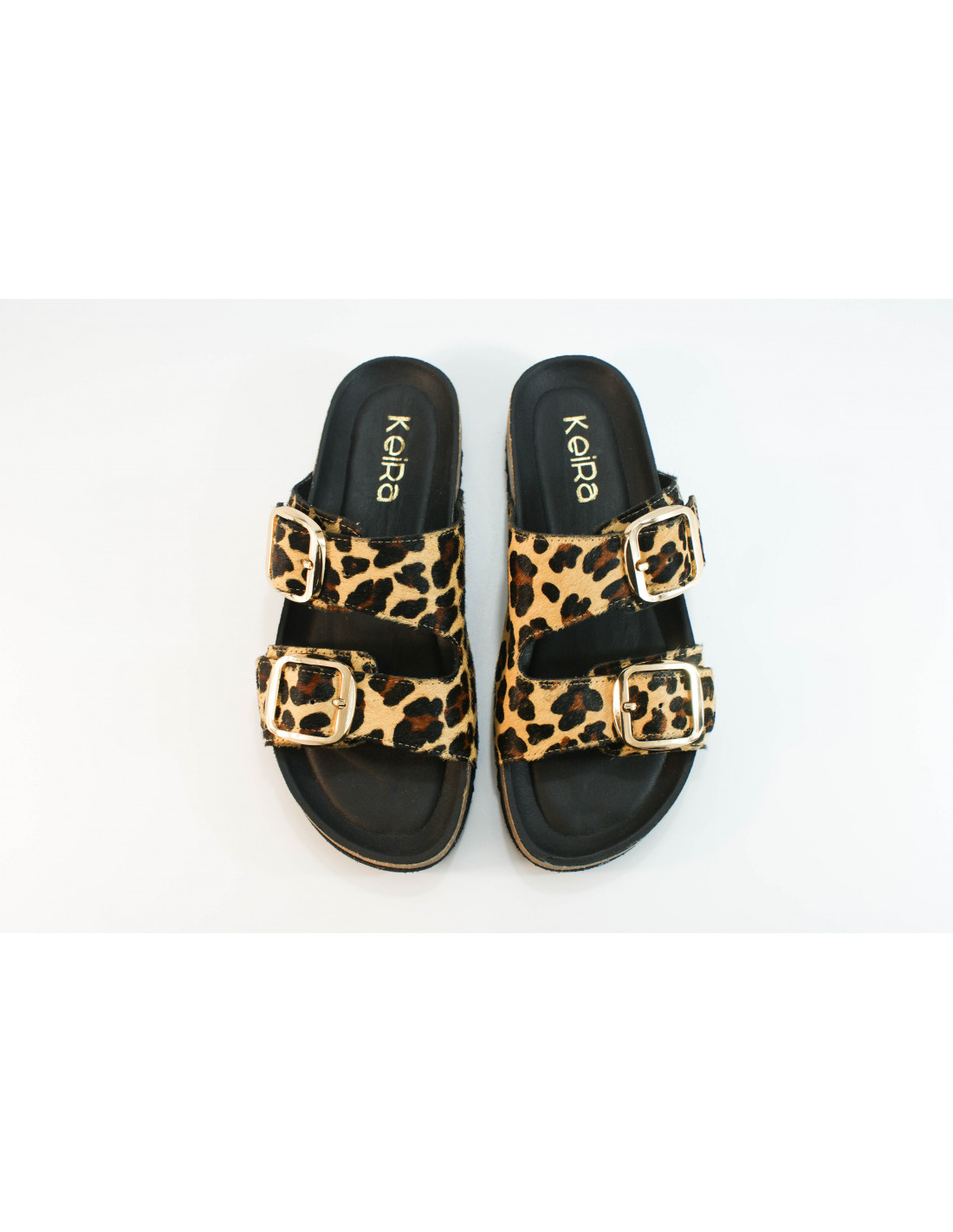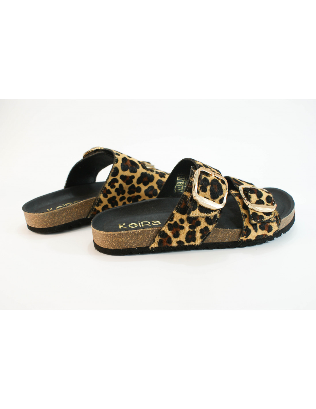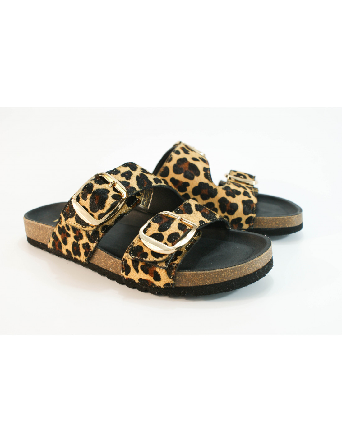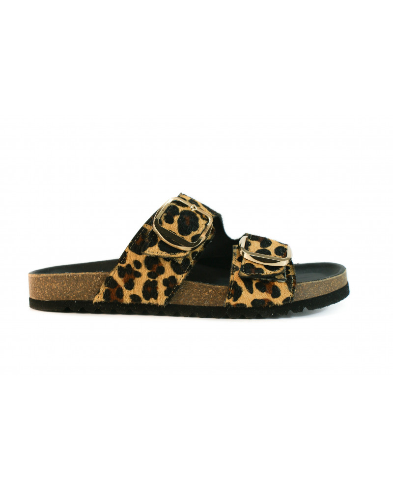 Sandalia bio con dos tiras en el empeine con hebillas doradas. Fabricado en piel pony imitación leopardo. Plantilla acolchada.