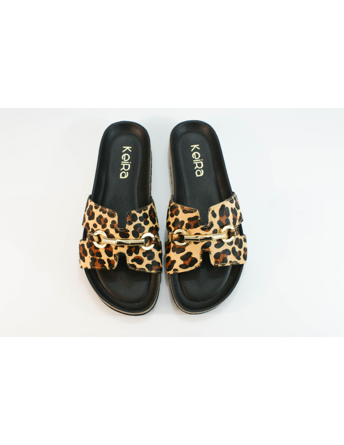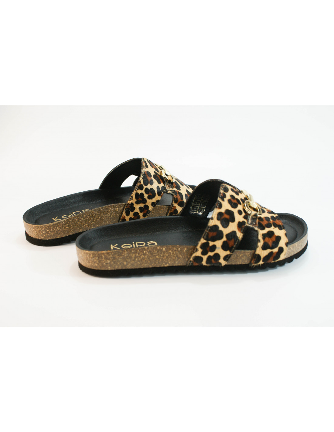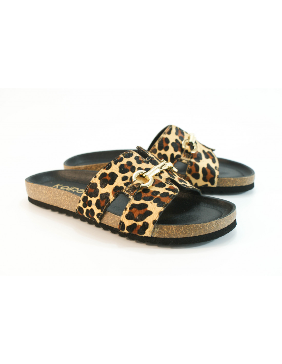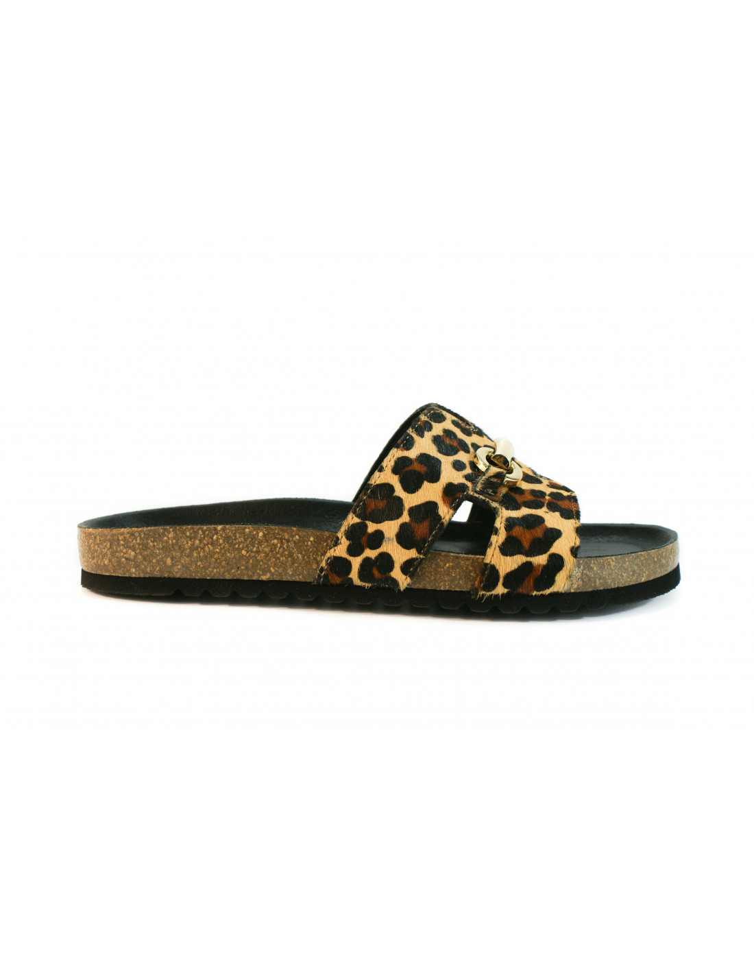 Sandalia bio con pala en forma de H con adorno dorado metálico. Fabricado en piel pony imitación leopardo. Plantilla acolchada.