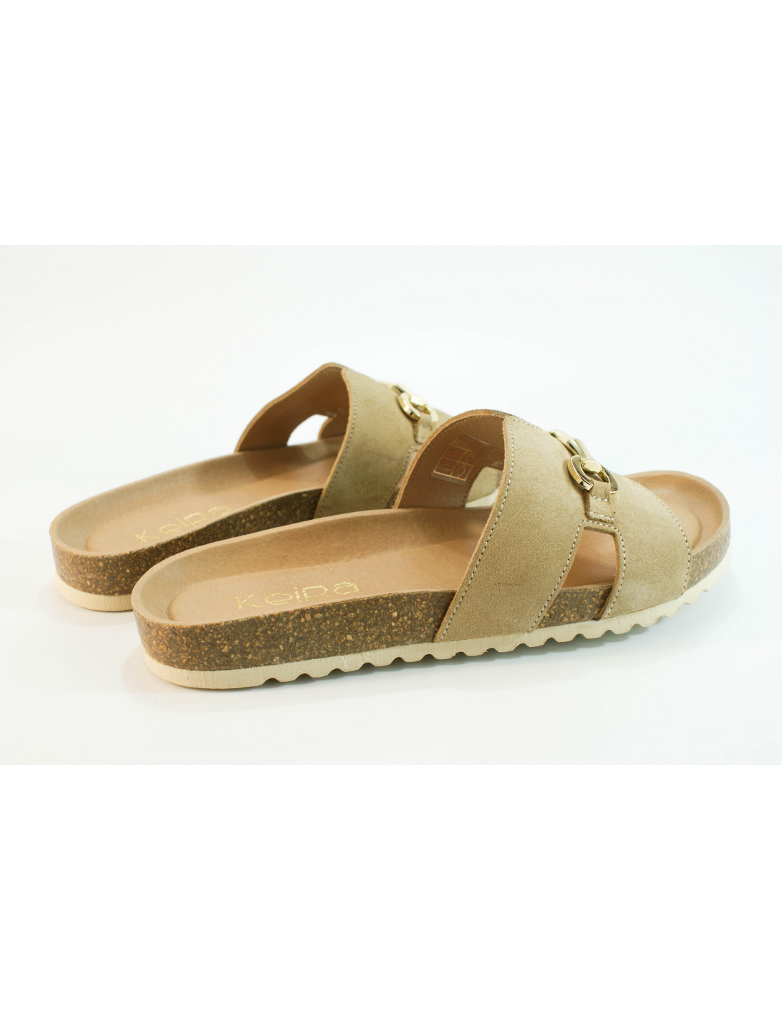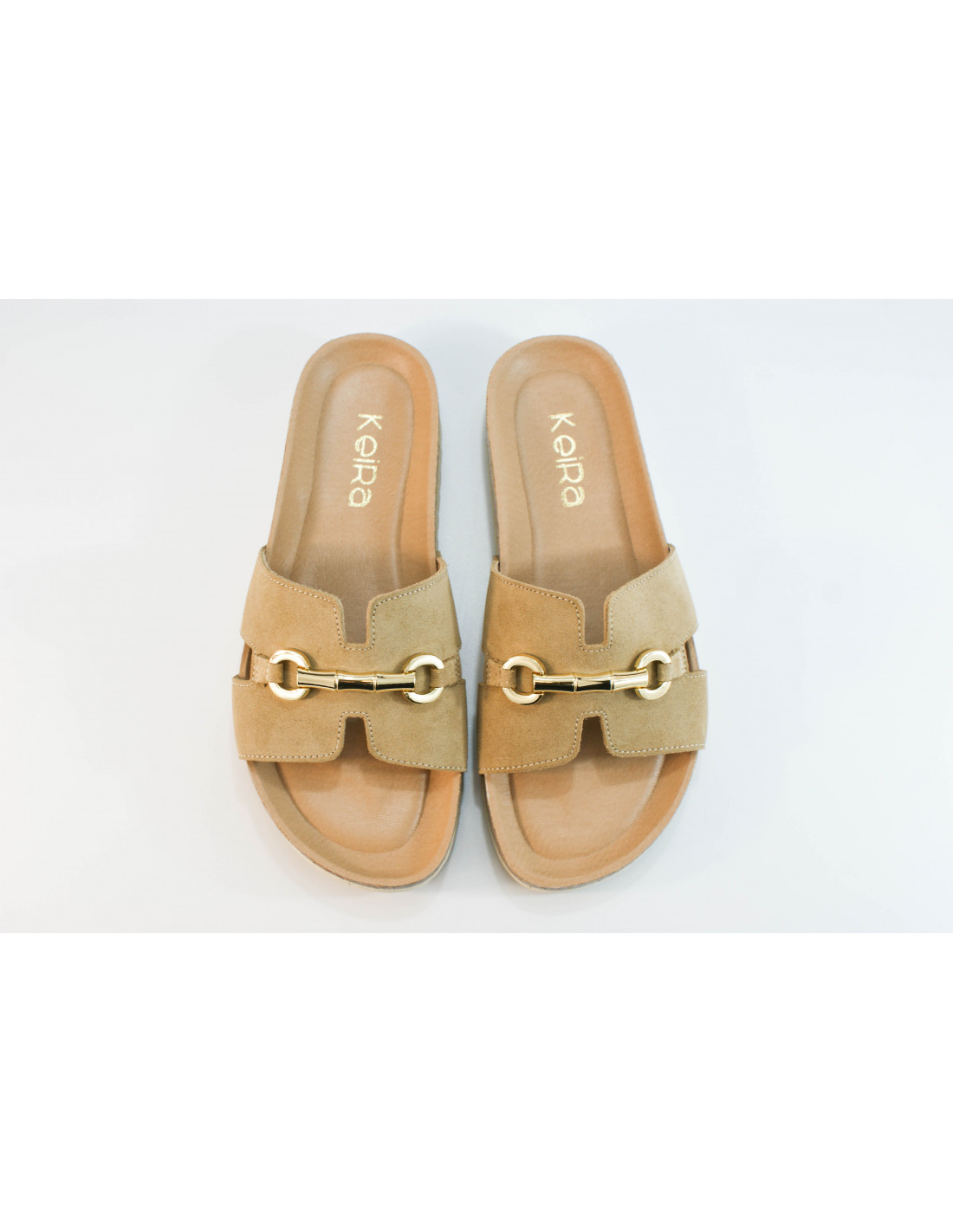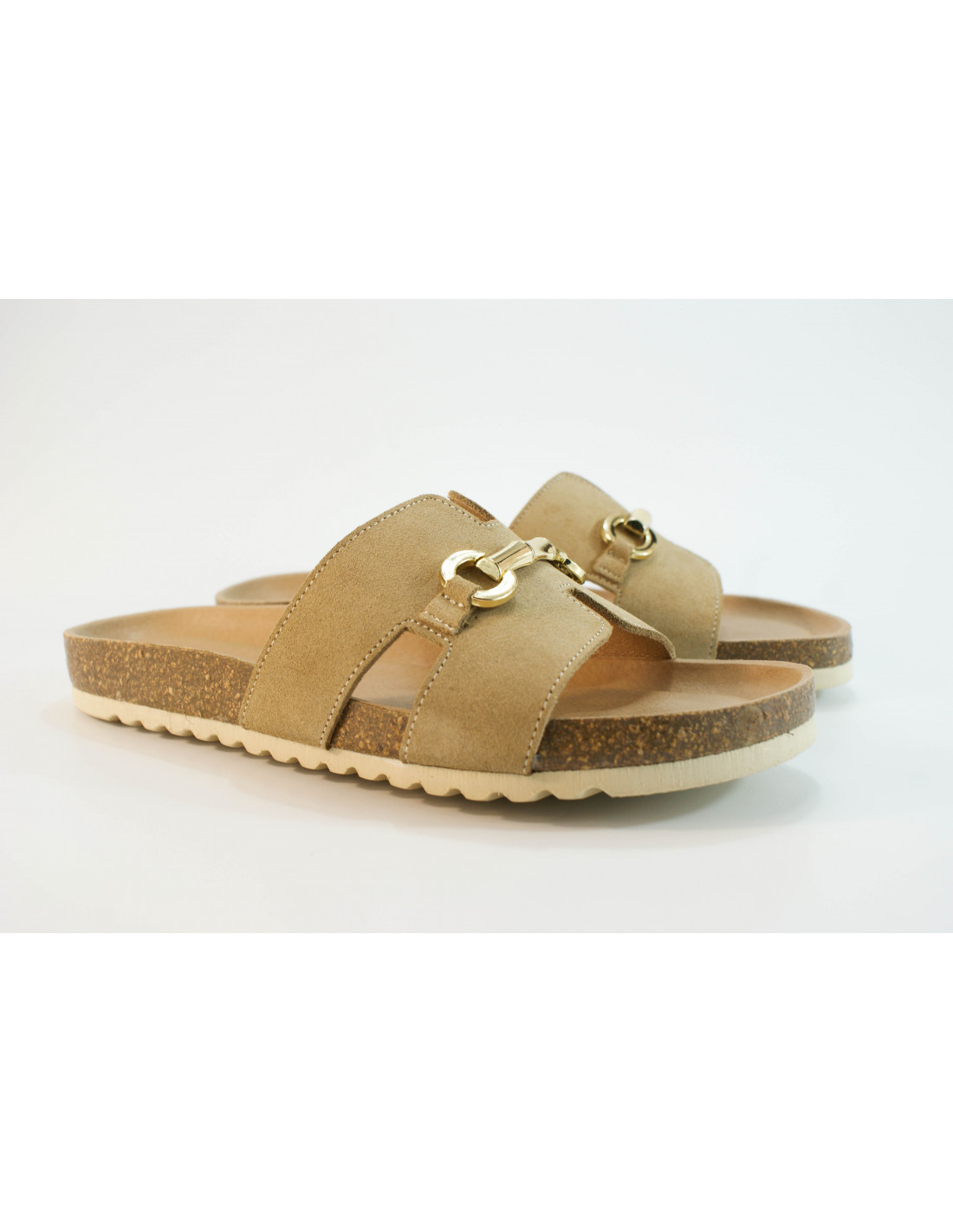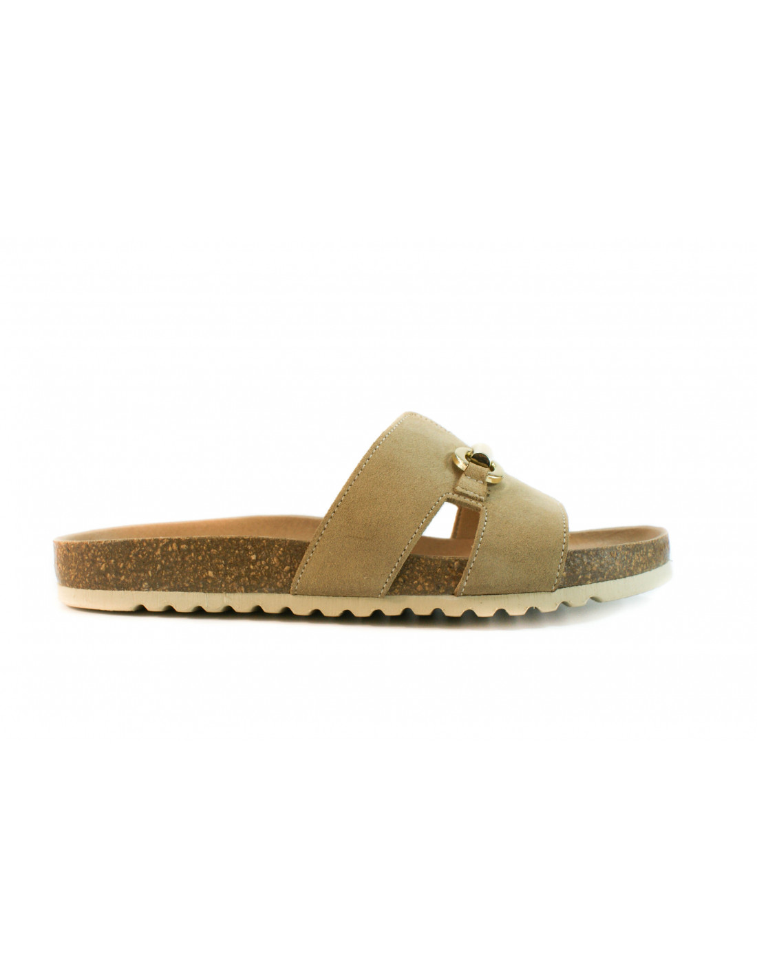 Sandalia bio con pala en forma de H con adorno dorado metálico. Fabricado en piel serraje beige. Plantilla acolchada.