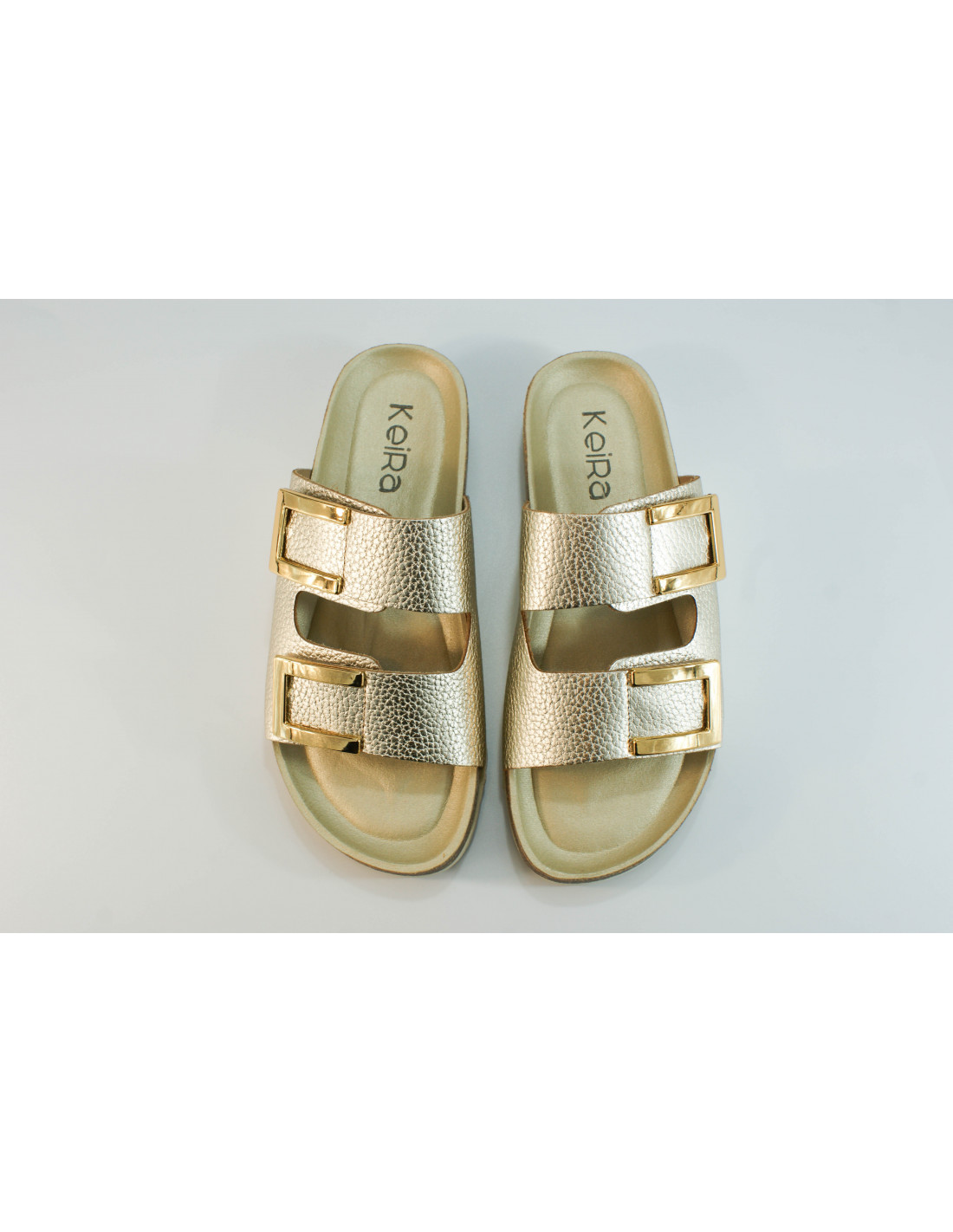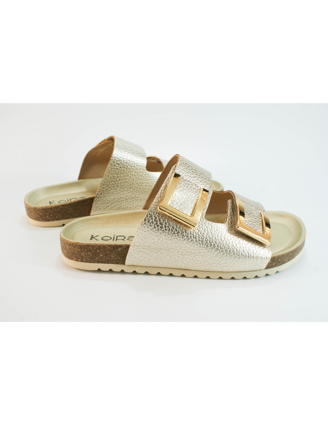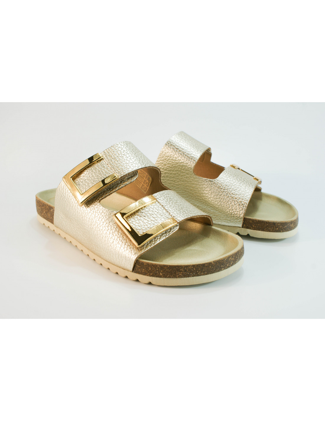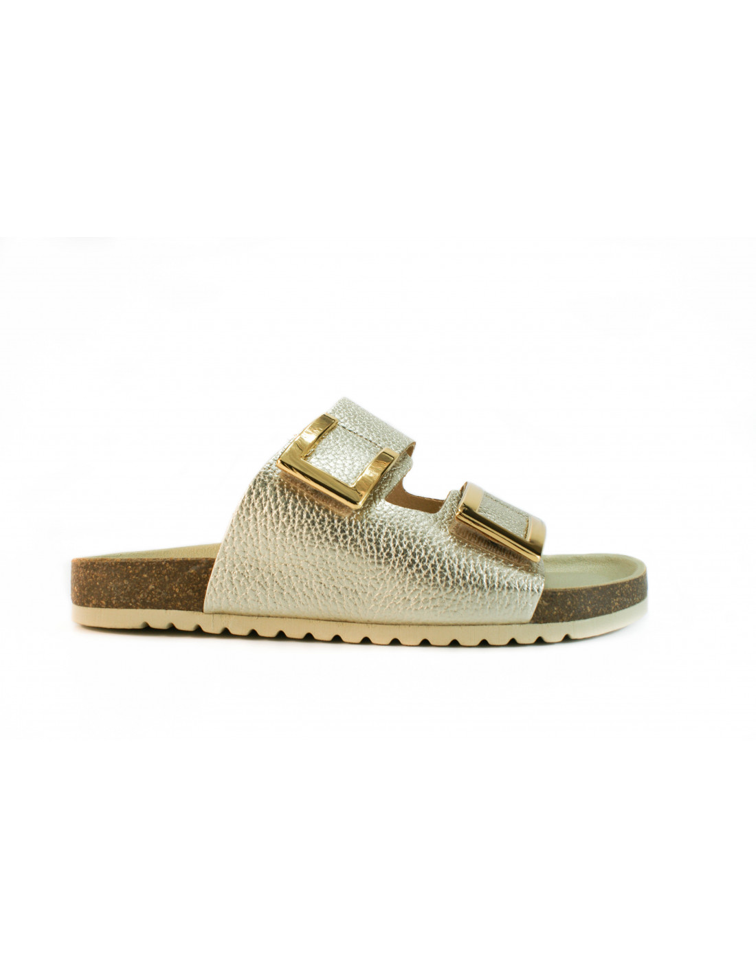 Sandalia bio con dos tiras con cierre velcro y detalle dorado. Fabricado en piel metalizada champán. Plantilla acolchada.
