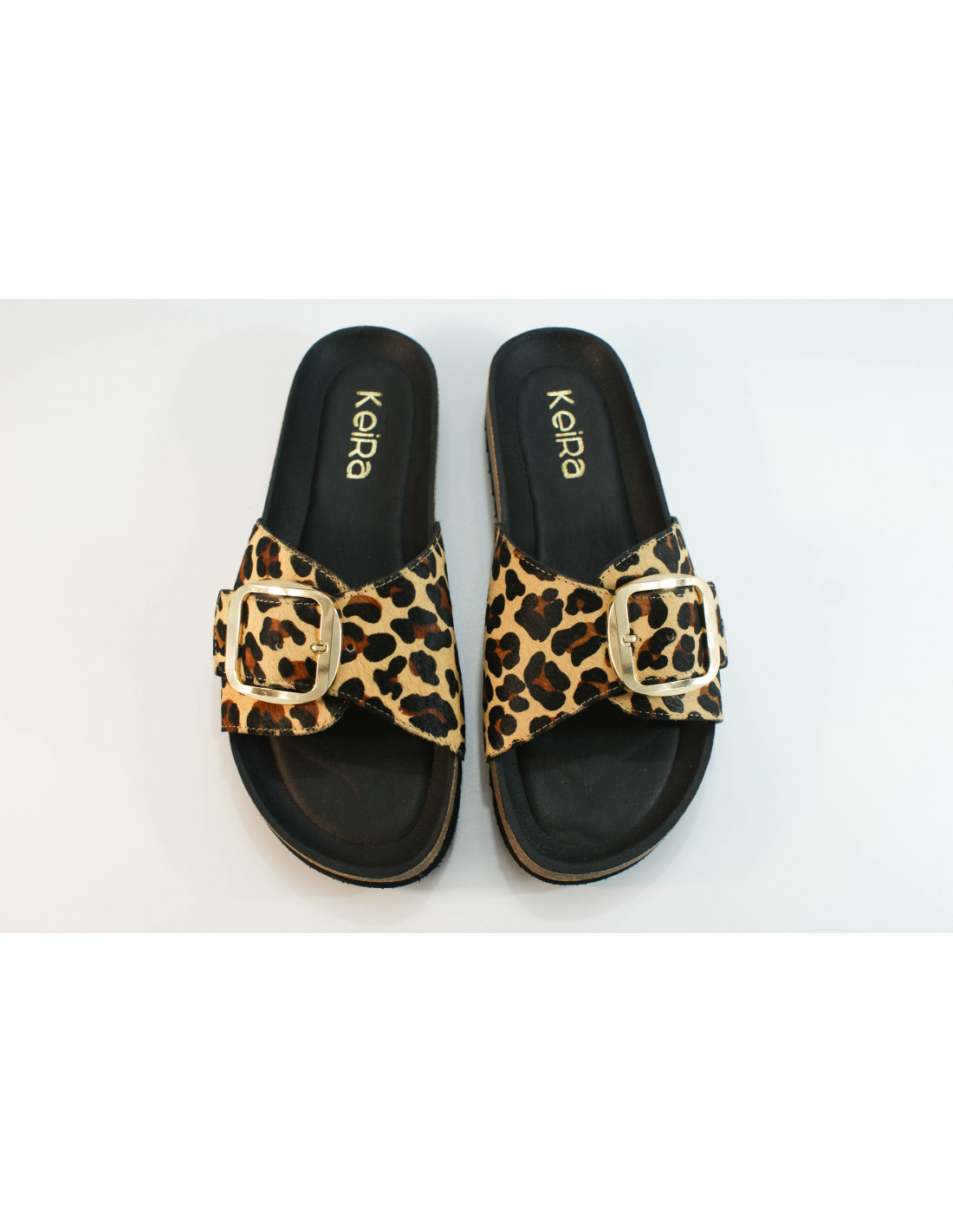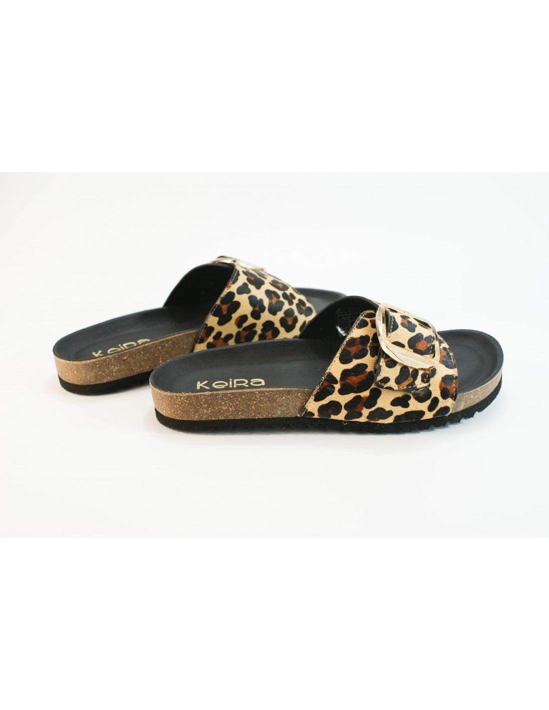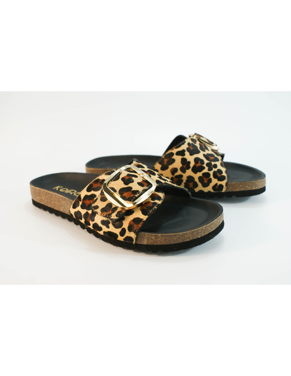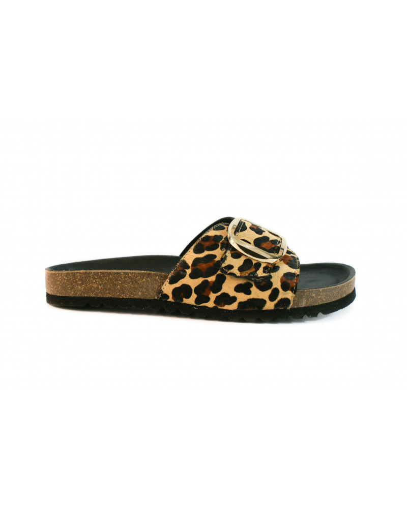 Sandalia bio con una pala con cierre de hebilla. Fabricado en piel pony imitación leopardo. Plantilla acolchada.