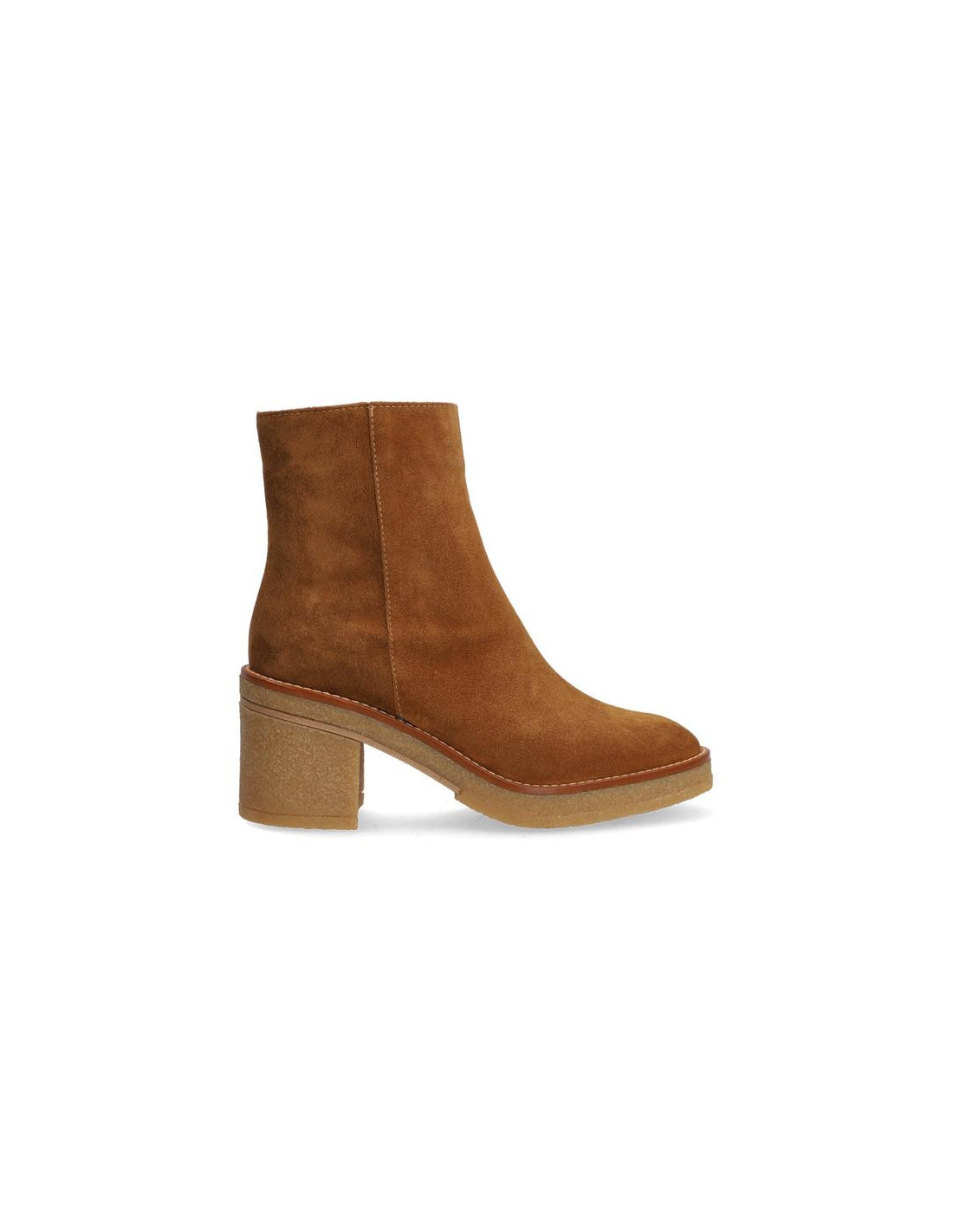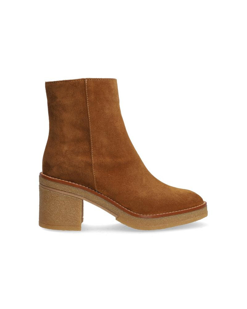 ALPE - Botín fabricado en serraje color cuero, cremallera interior. Suela de crepe con una altura de tacón de 7 cms.