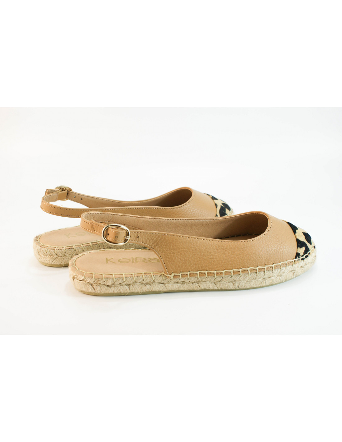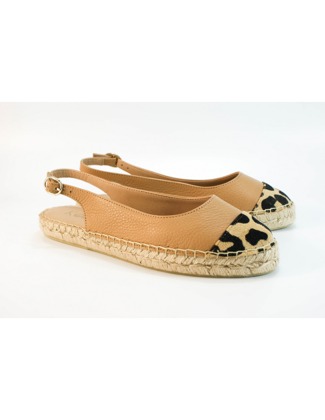 Alpargata con piso de esparto de dos cuerdas, realizada en combinación de serraje imitación leopardo y piel camel. Plantilla acolchada de piel y suela de goma. Fabricado en España. Disponible en más c