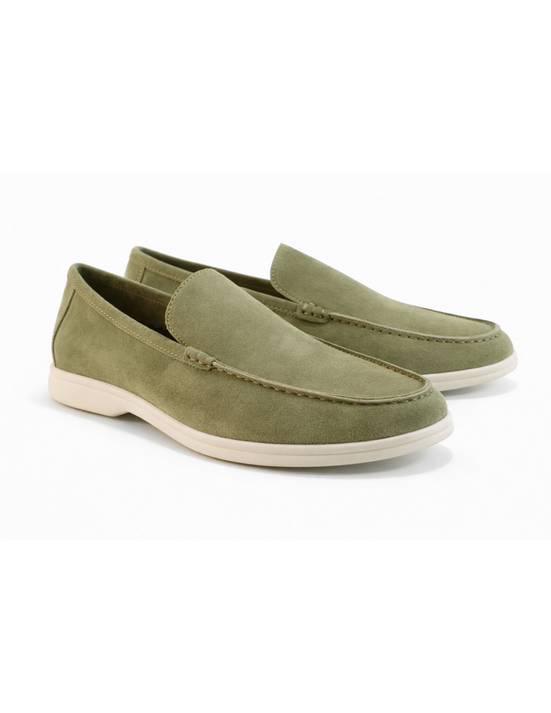 Mocasín de caballero con antifaz, fabricado en ante kaki. Piso de goma blanco, sin forro y con plantilla de piel.