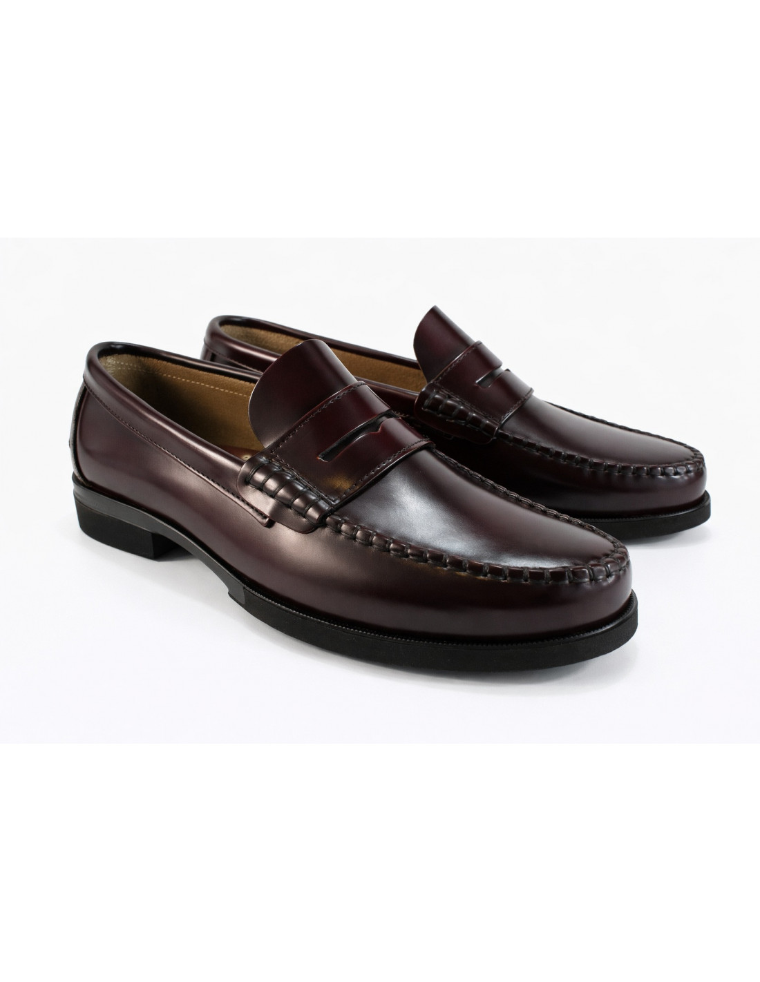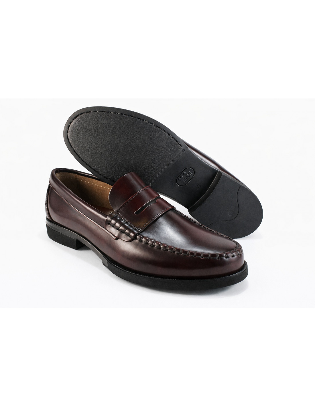 Mocasín clásico de la marca EMIREY, fabricado en piel florentic burdeos, sin forro y con piso de goma extralight.