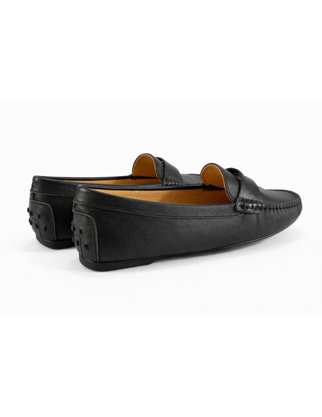 Mocasín fabricado en piel negro con tira antifaz en el empeine y gominos en la parte trasera. Forro y plantilla de piel. Suela de goma. Tacón de 1 cm.