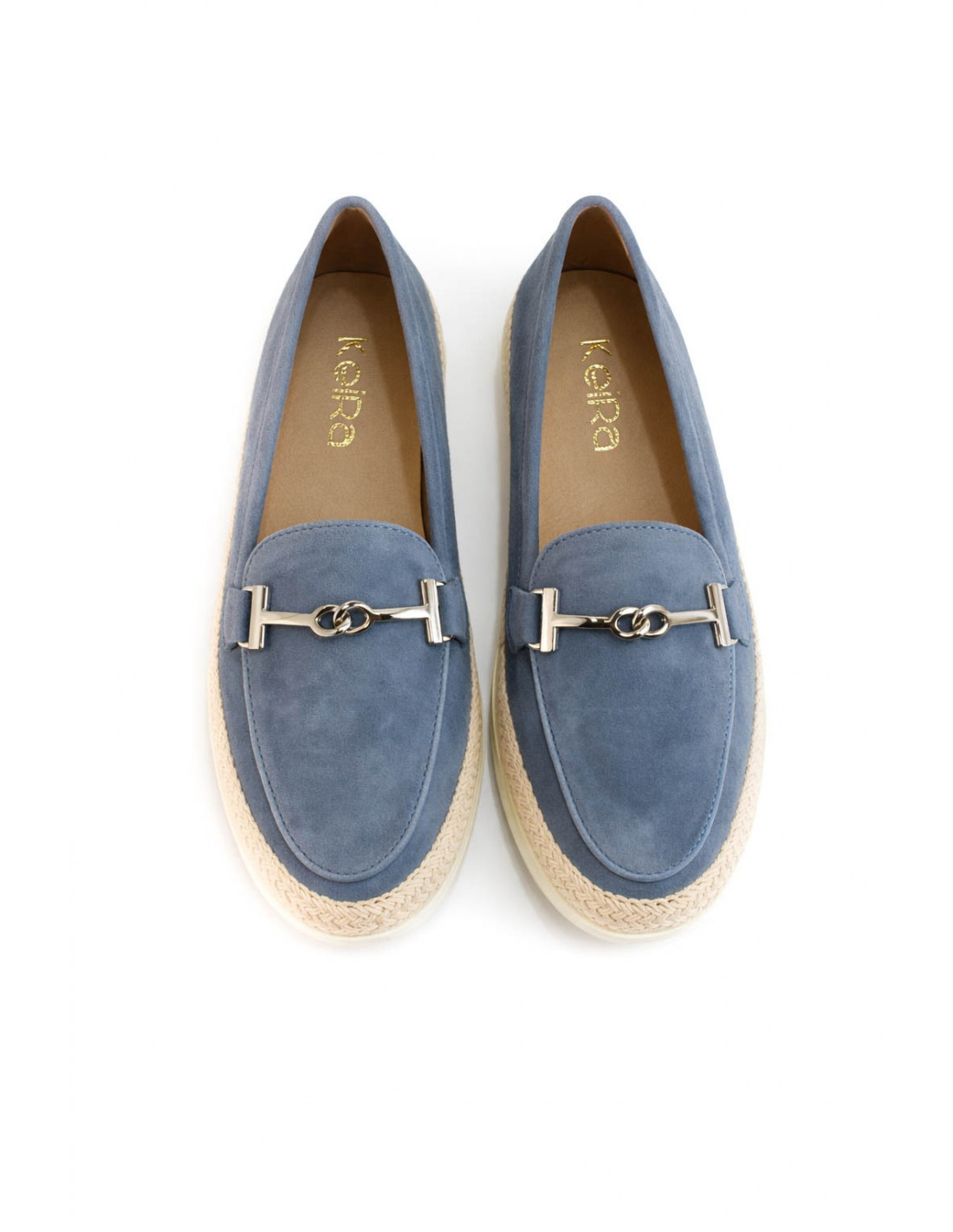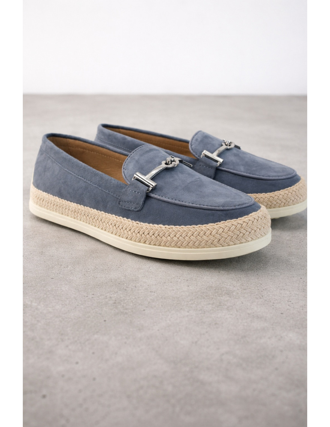 Mocasines casuales en ante azul con detalle metálico. Diseño slip-on, cómodos y versátiles. Suela tipo yute con base antideslizante. Ideales para looks casuales o semi-formales con un toque moderno.