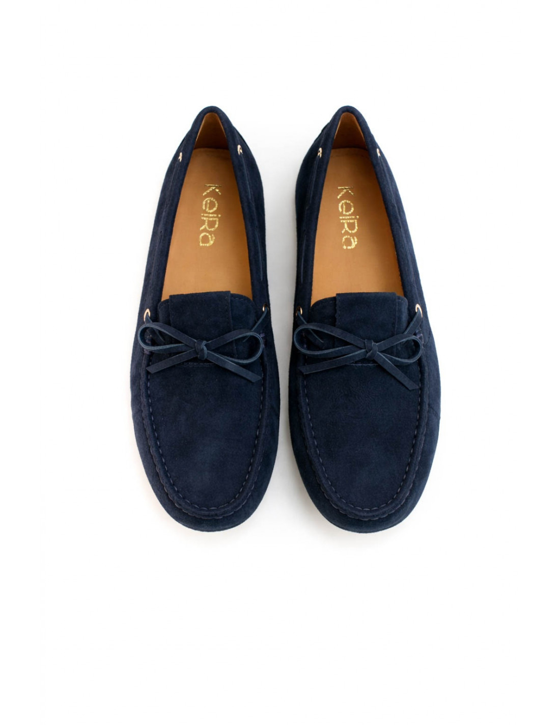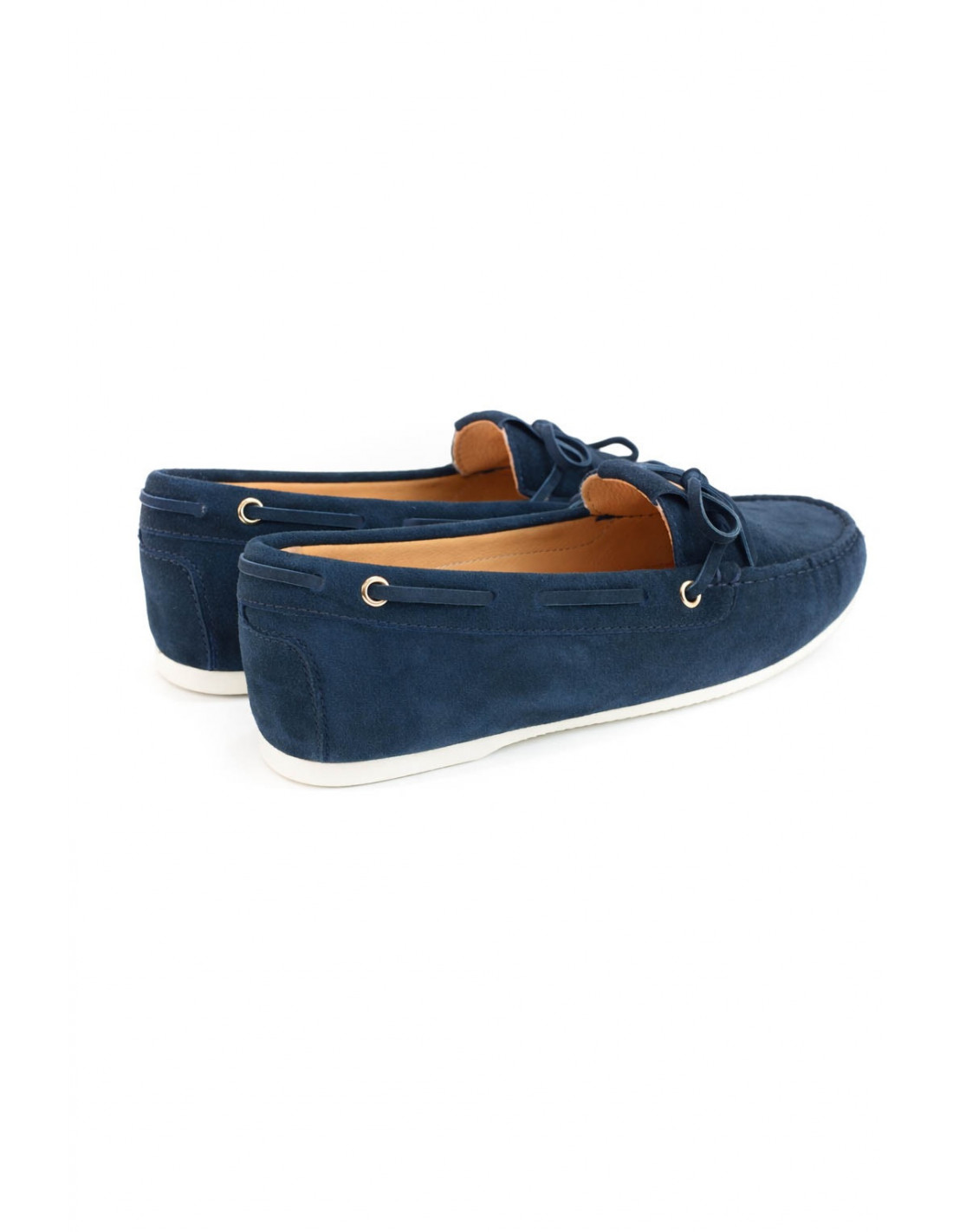 Mocasín tipo náutico en serraje azul marino, con diseño slip-on y detalle de lazo decorativo en el empeine. Suela de goma flexible que aporta comodidad y estilo casual para uso diario.