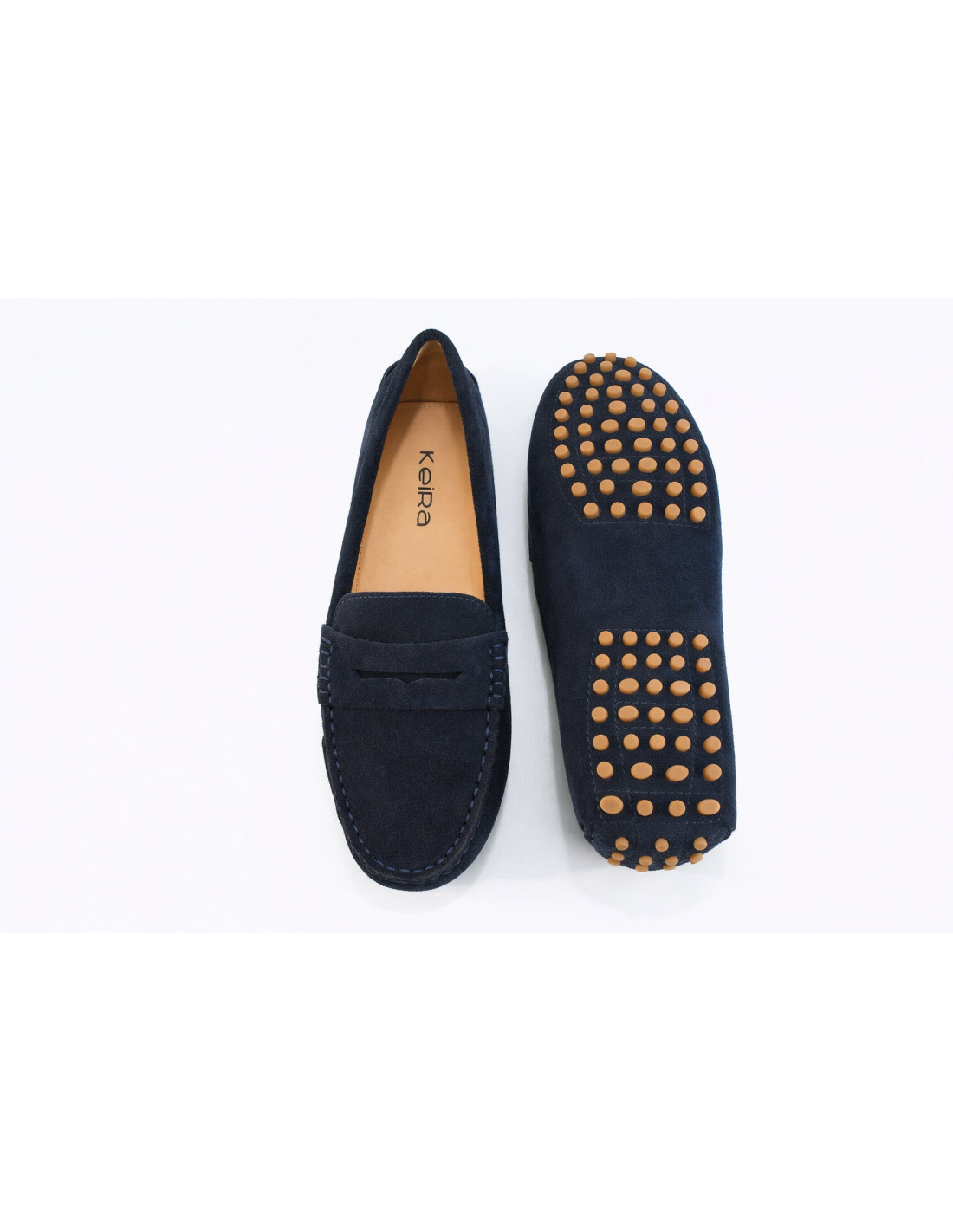 Mocasín con piso tipo conductor de tacos en goma. Fabricado en serraje con banda antifaz.Interior en piel.