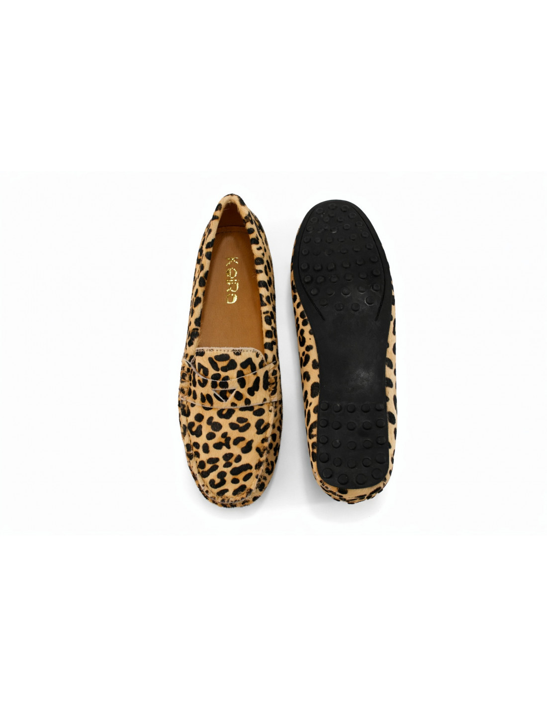 Mocasin fabricado en pony natural con grabado imitación leopardo y gominos en el talón. Forro y plantilla de piel. Suela de goma. Tacón de 1 cms.