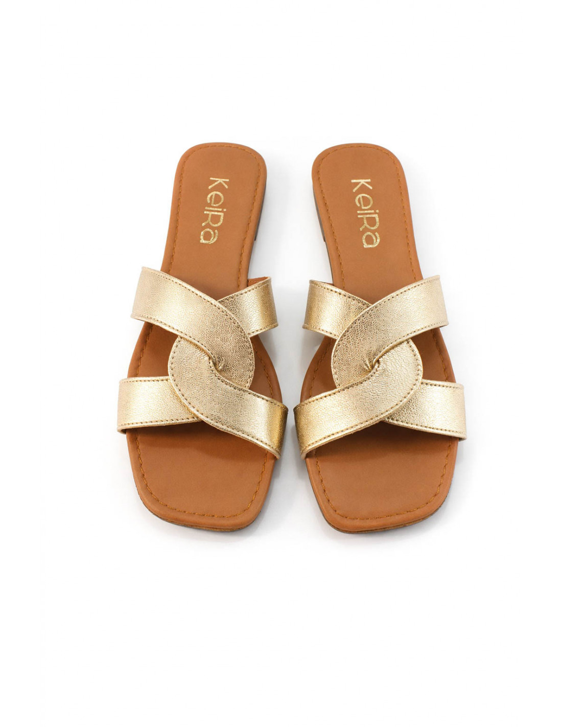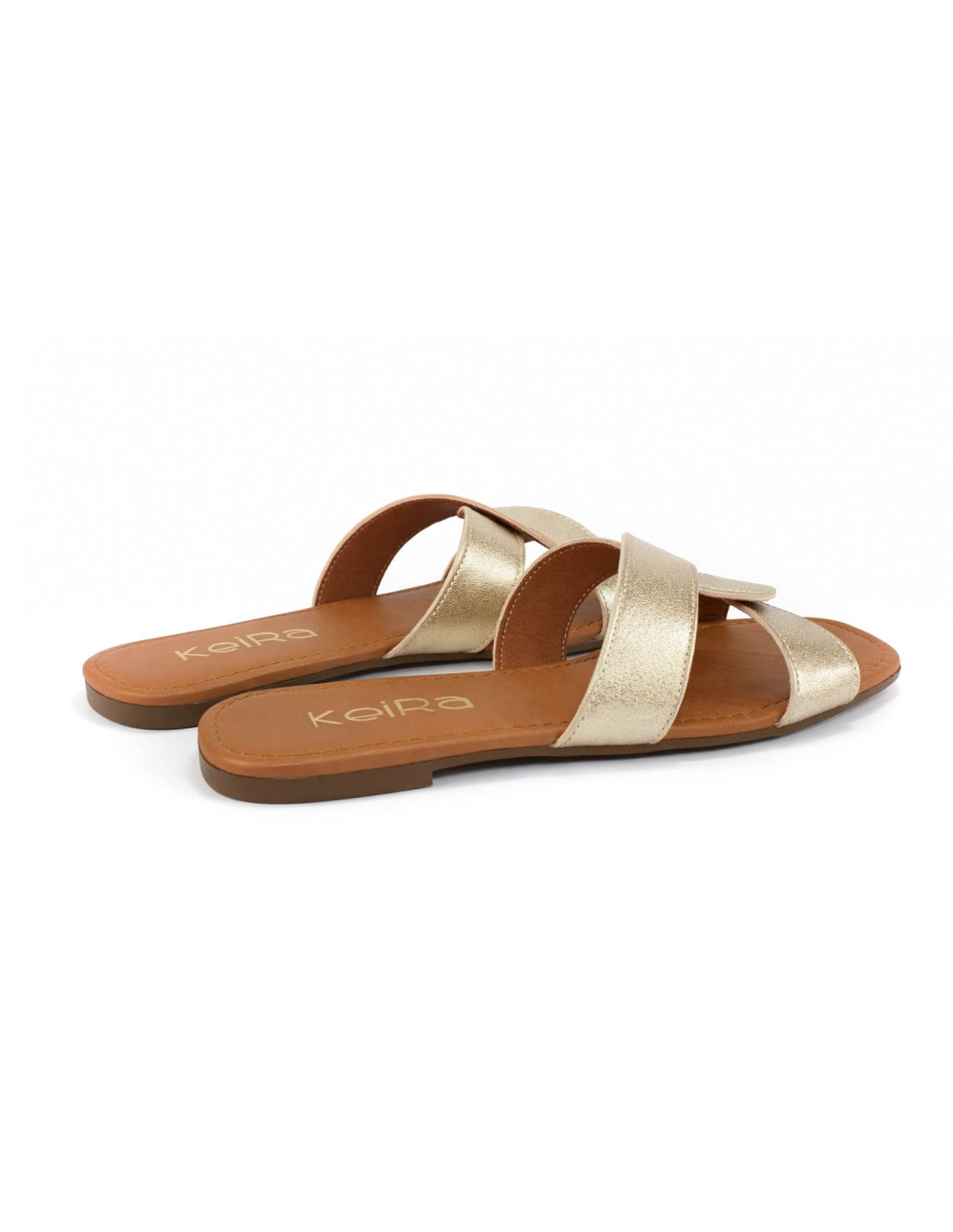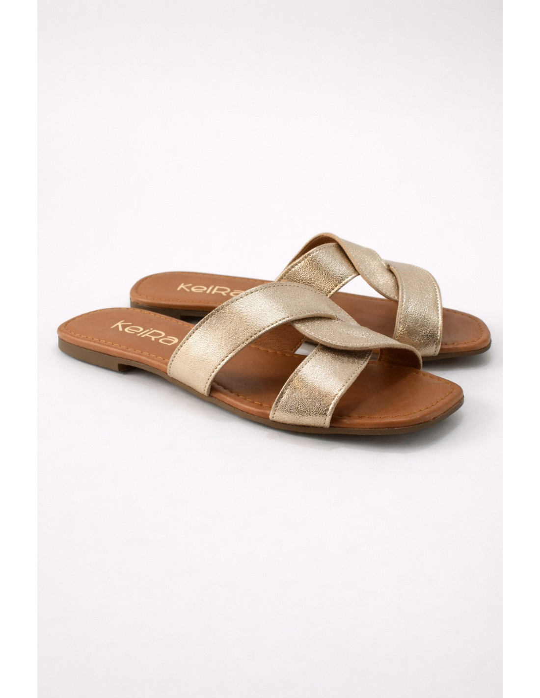 Aporta un toque sofisticado y luminoso a tus looks con estas sandalias planas de diseño cruzado en acabado en piel metalizadao dorado. Su estilo minimalista con tiras anchas entrelazadas combina elegancia y modernidad, convirtiéndolas en el complemento perfecto para cualquier ocasión. Plantilla acolchada de piel.