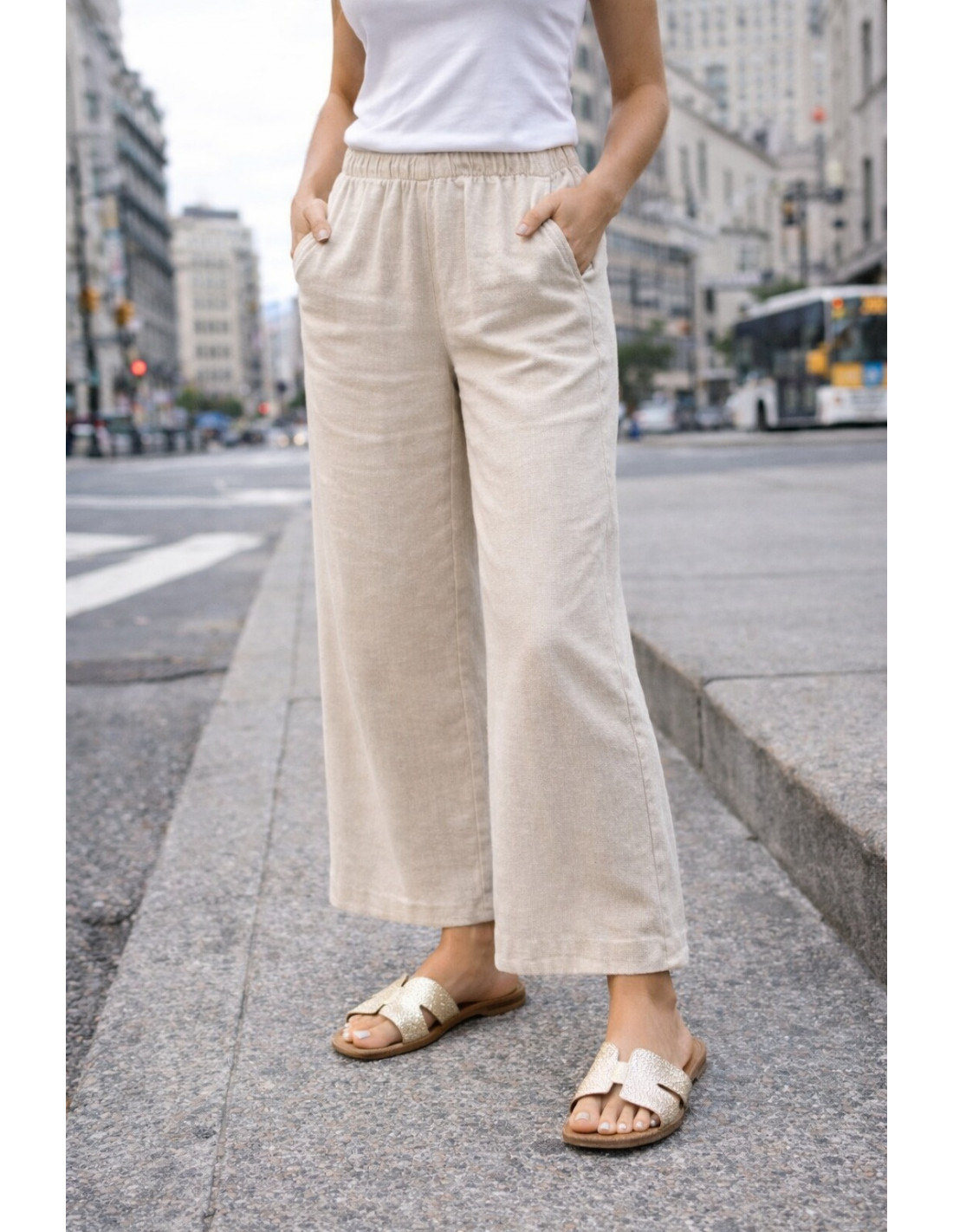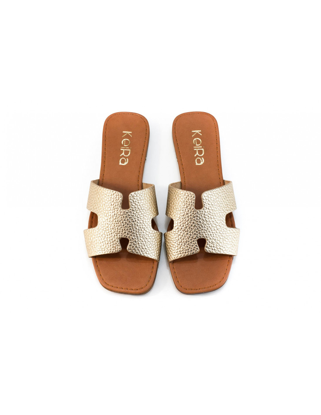 Sofisticación y estilo minimalista se unen en estas sandalias planas con diseño tipo H. Su acabado en piel metalizado dorado aporta un brillo elegante y moderno, perfecto para elevar cualquier look con un toque sutil de glamour. La tira ancha con textura grabada ofrece un acabado visual atractivo y mayor sujeción, mientras que la plantilla en tono cuero con logo dorado aporta contraste y un detalle premium. Su suela plana y ligera garantiza comodidad para acompañarte durante todo el día. Plantilla acolchada de piel.