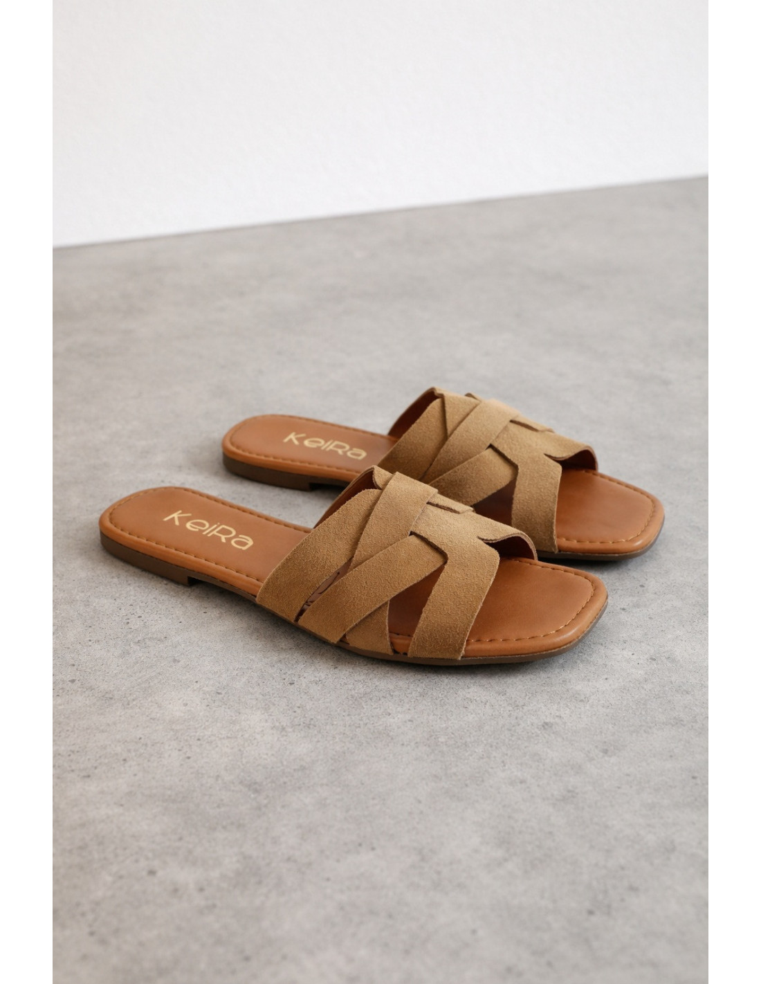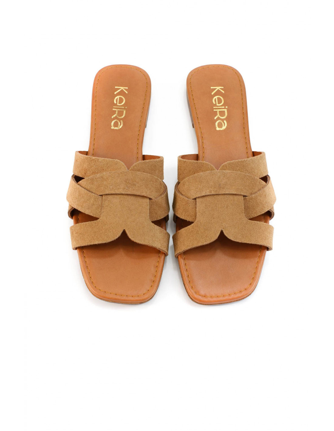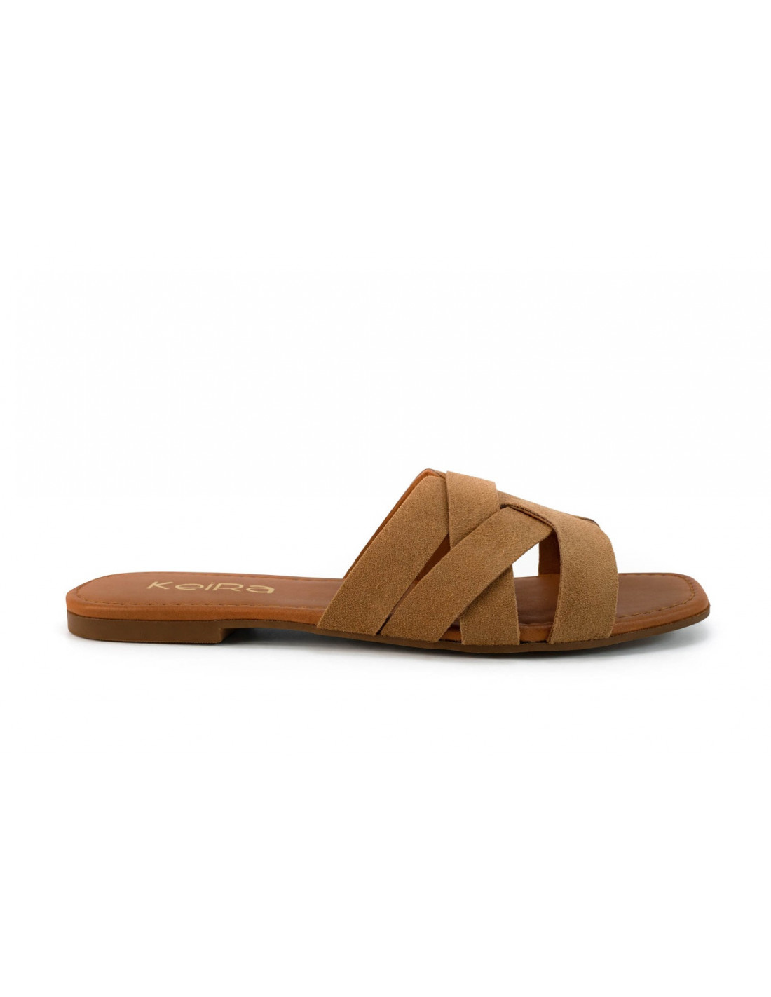 Sandalias planas de serraje coñac con tiras cruzadas, presentan un elegante diseño de tiras anchas que brindan mayor sujeción y comodidad al caminar. Plantilla acolchada de piel y suela de goma