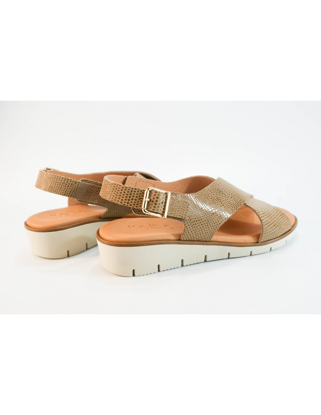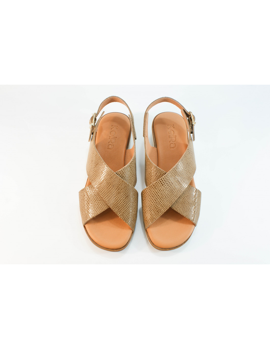 Sandalia de tiras cruzadas fabricada en piel grabada camel. Suela ligera de goma de 3 cms. de altura. Plantilla acolchada de piel.