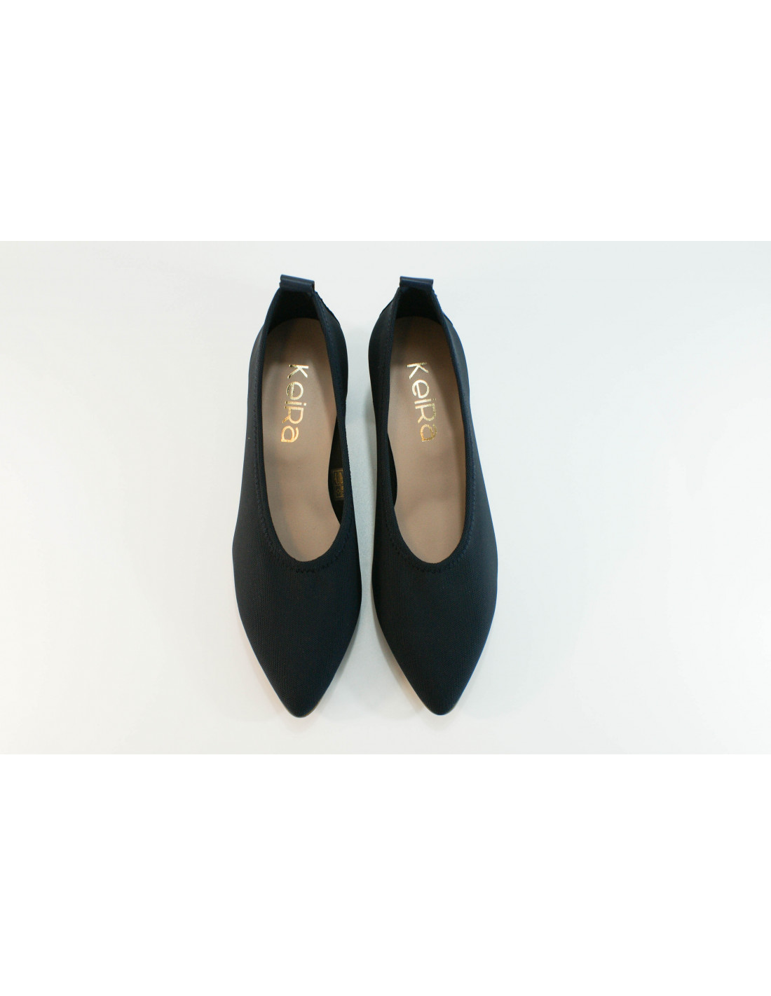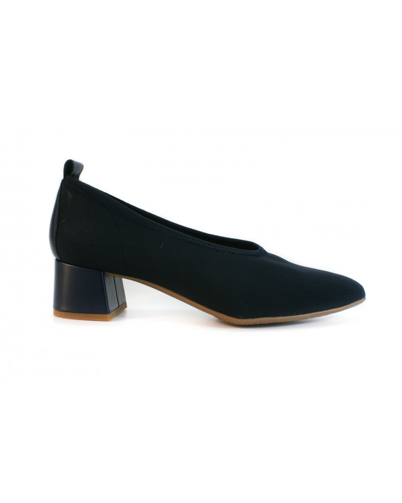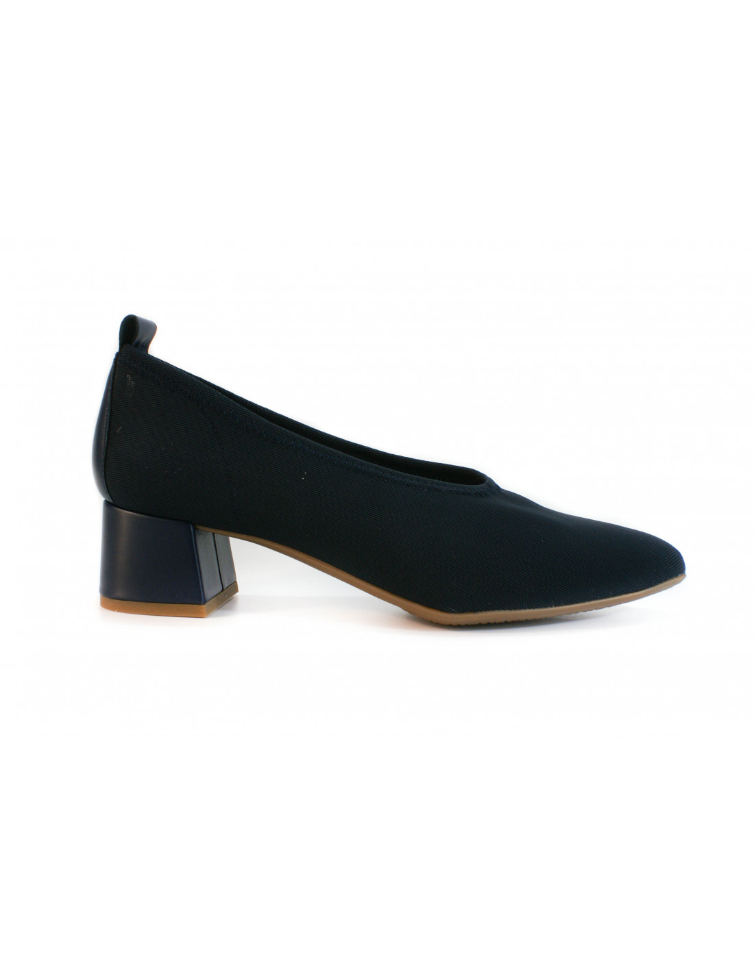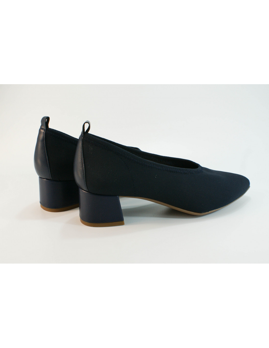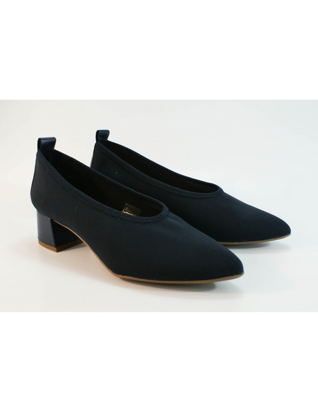 Salón de punta fina realizado en tejido elástico azul marino con tacón de piel. Forro textil, plantilla de piel y suela de goma. Tacón de 4,5 cms.