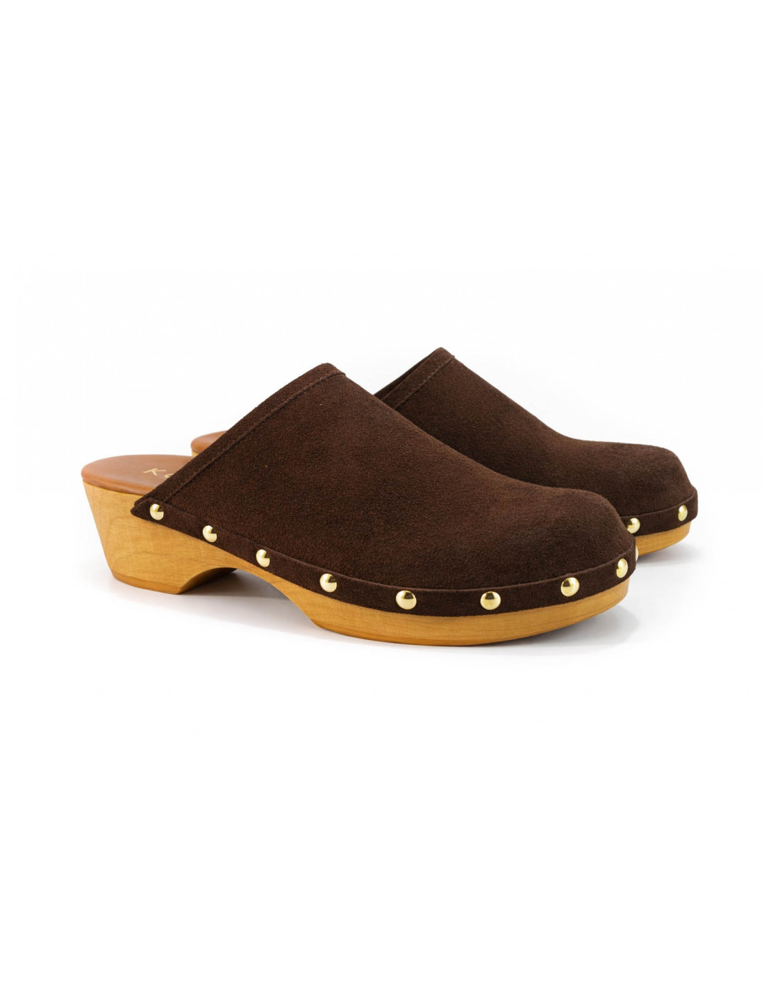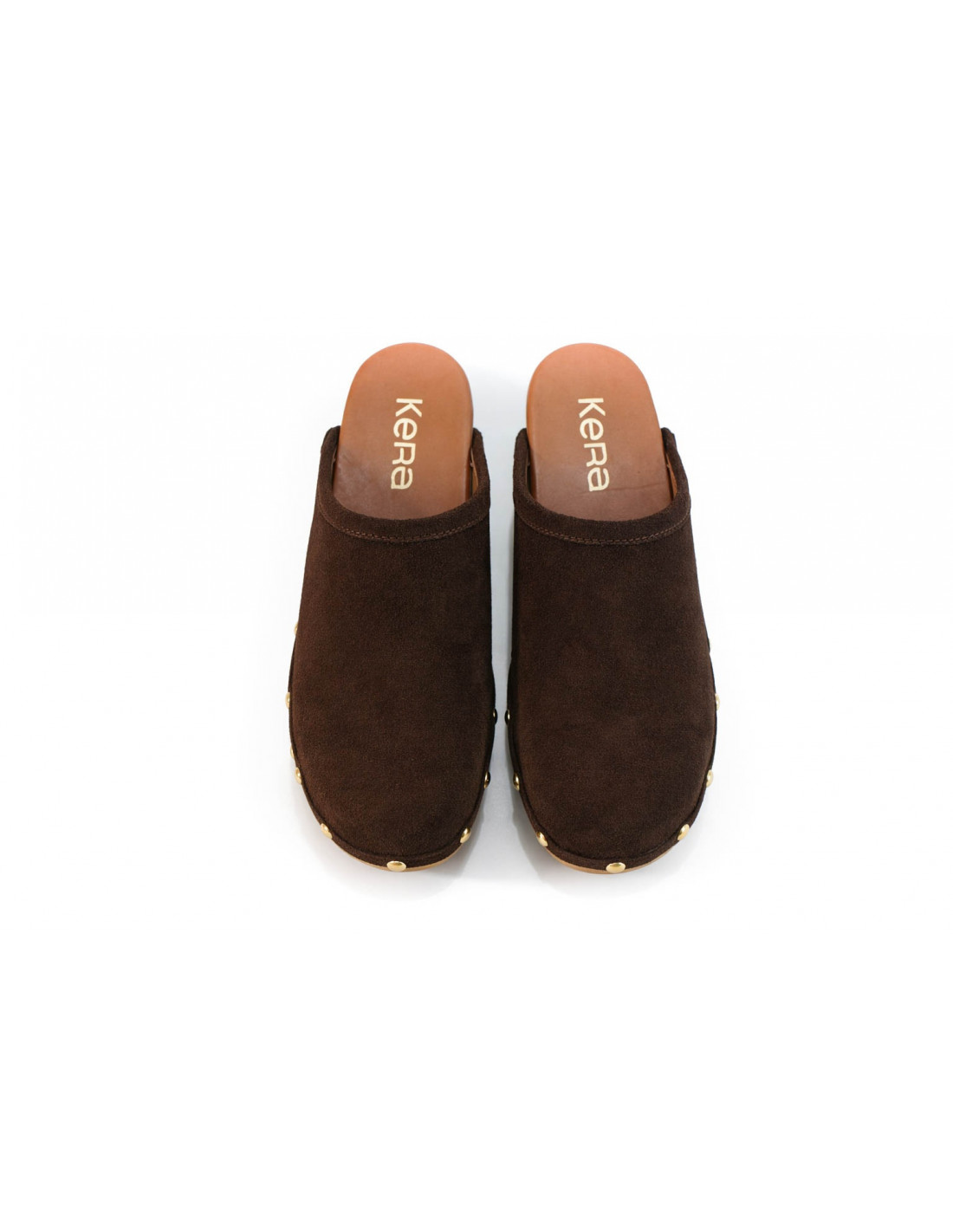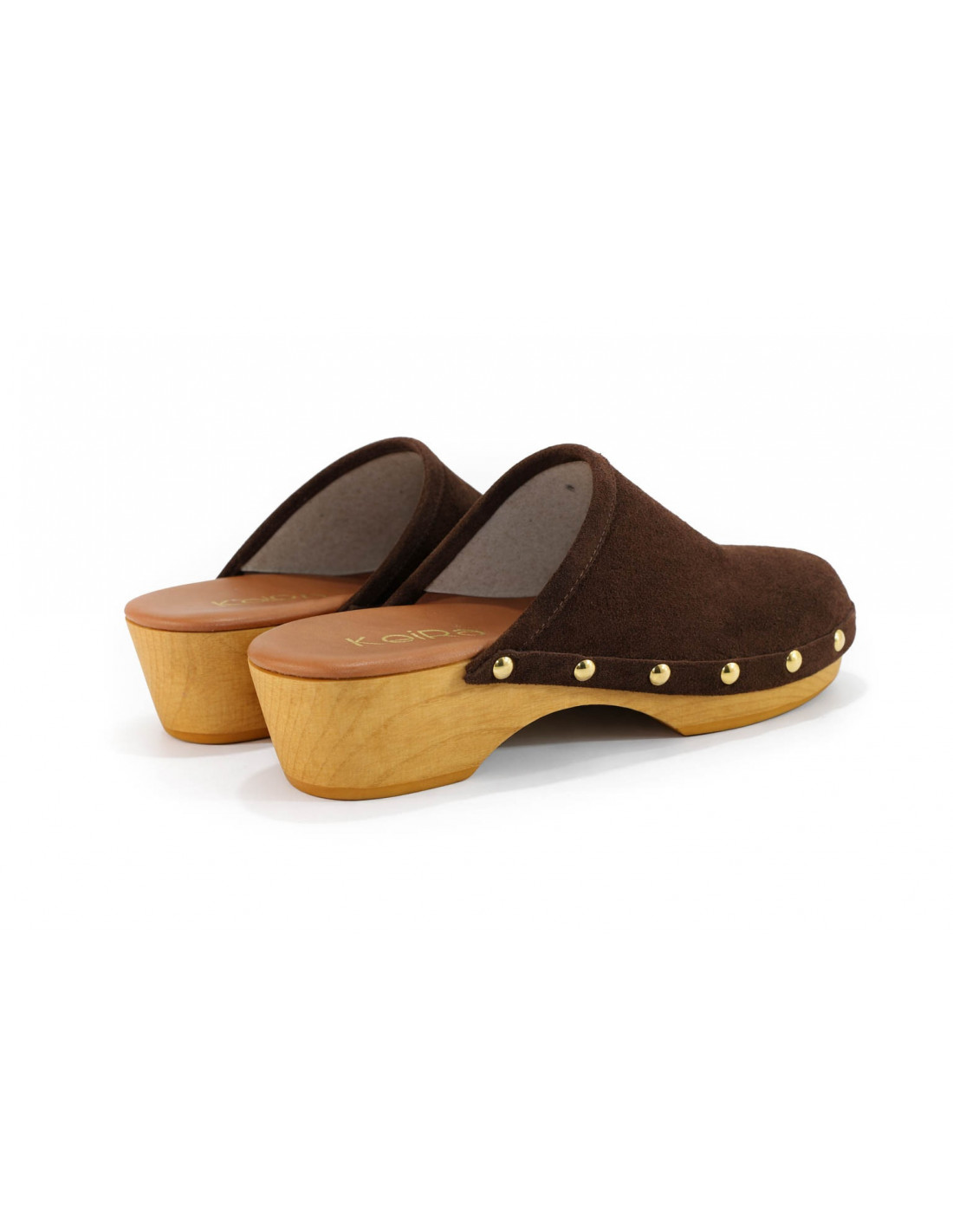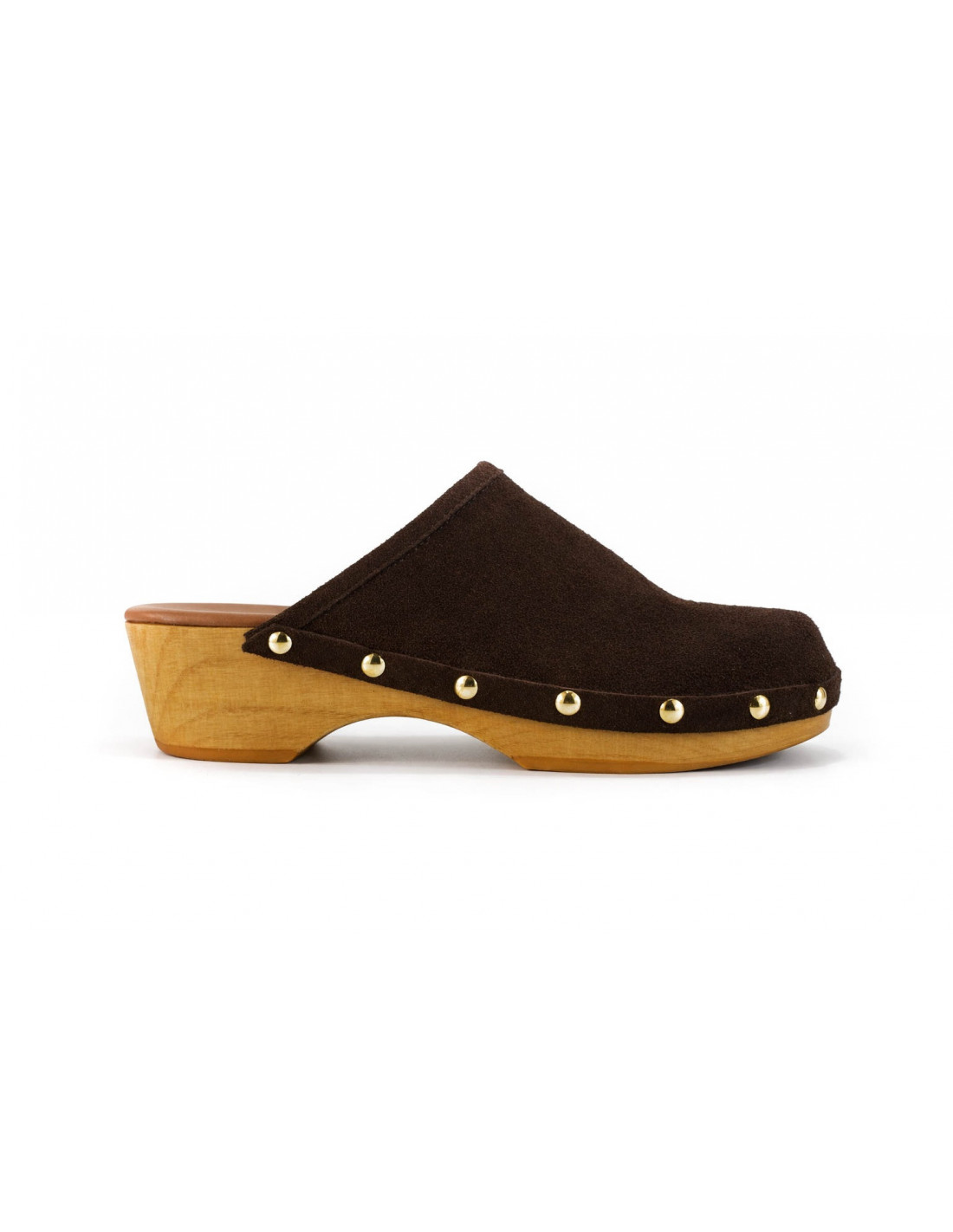 Estos zuecos en tono marón combinan el encanto artesanal con un diseño cómodo y actual. Confeccionados en serraje, presentan una pala ancha que sujeta el pie con firmeza y aporta un estilo natural.