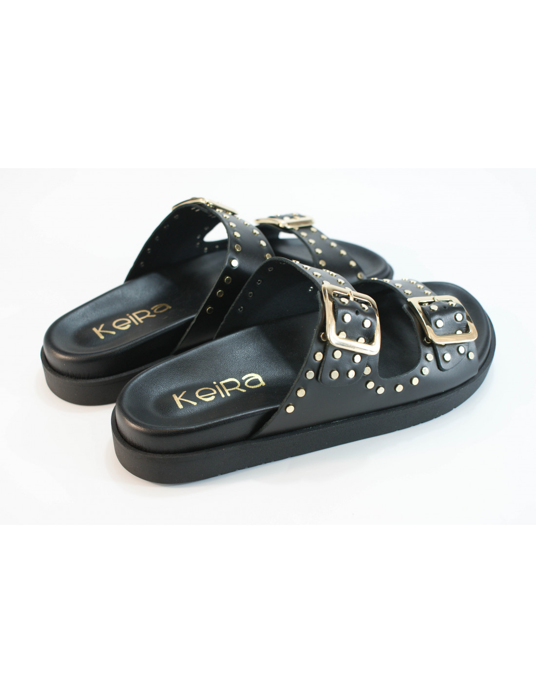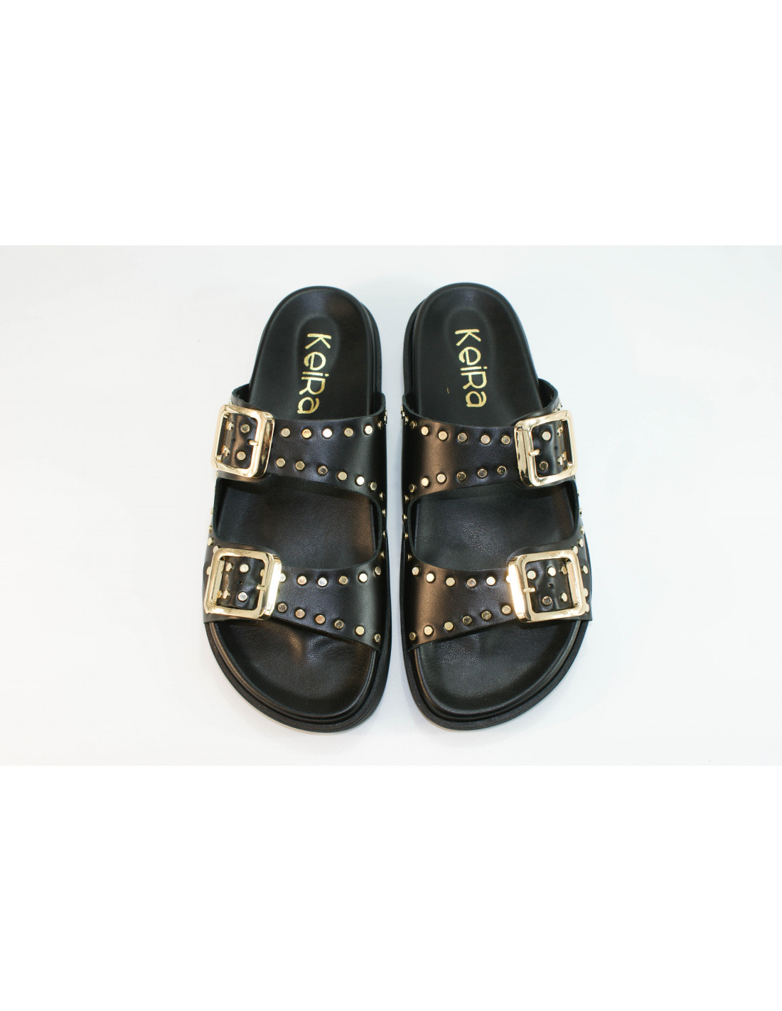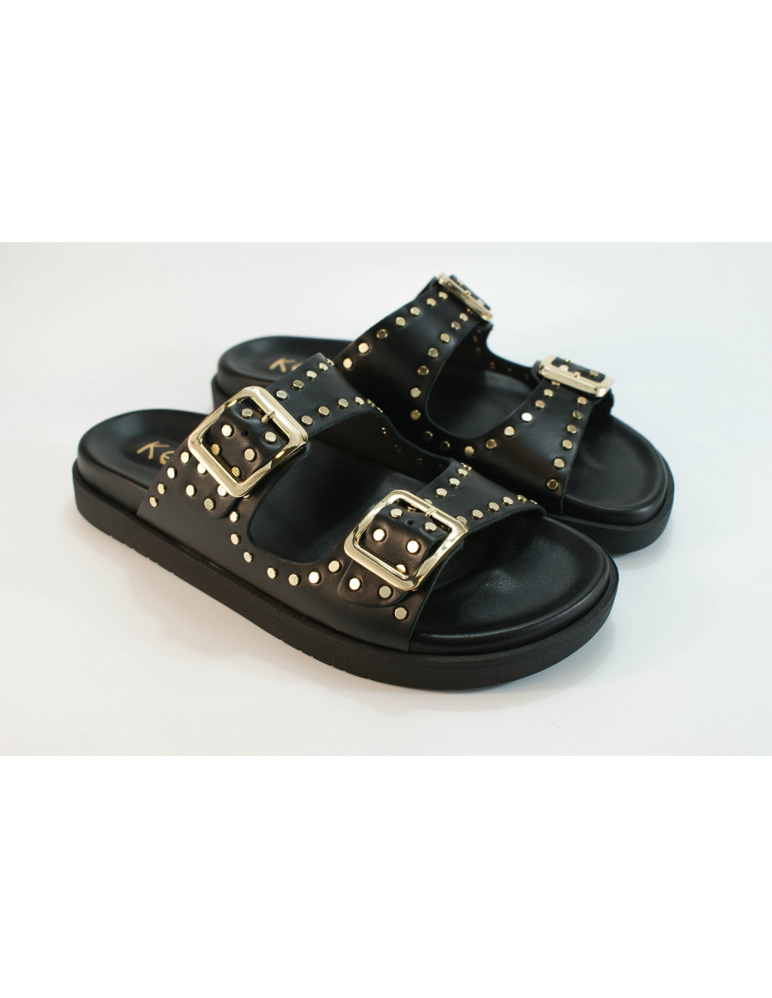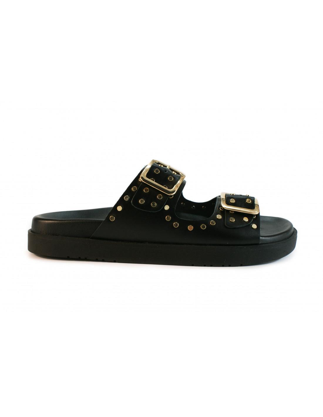 Leather bio-sandal with gold metal buckles and studs. Lined insole and 3 cm high rubber sole.