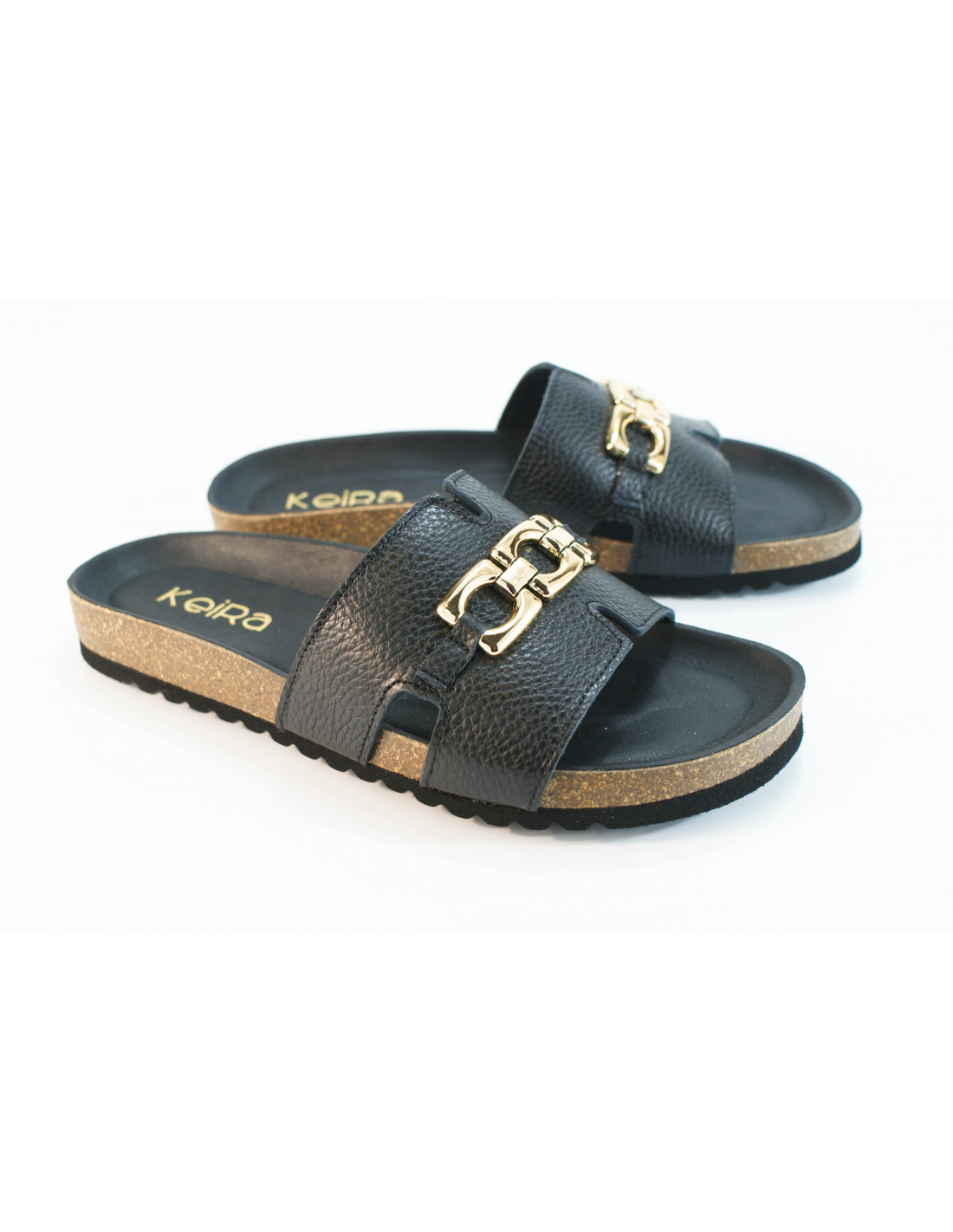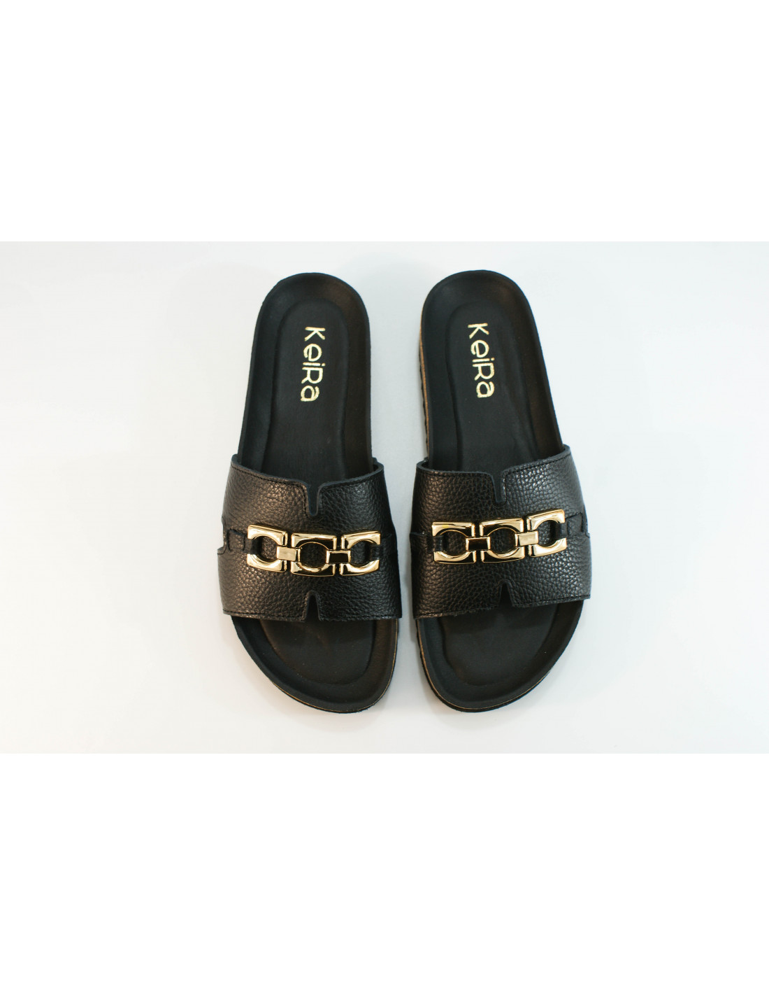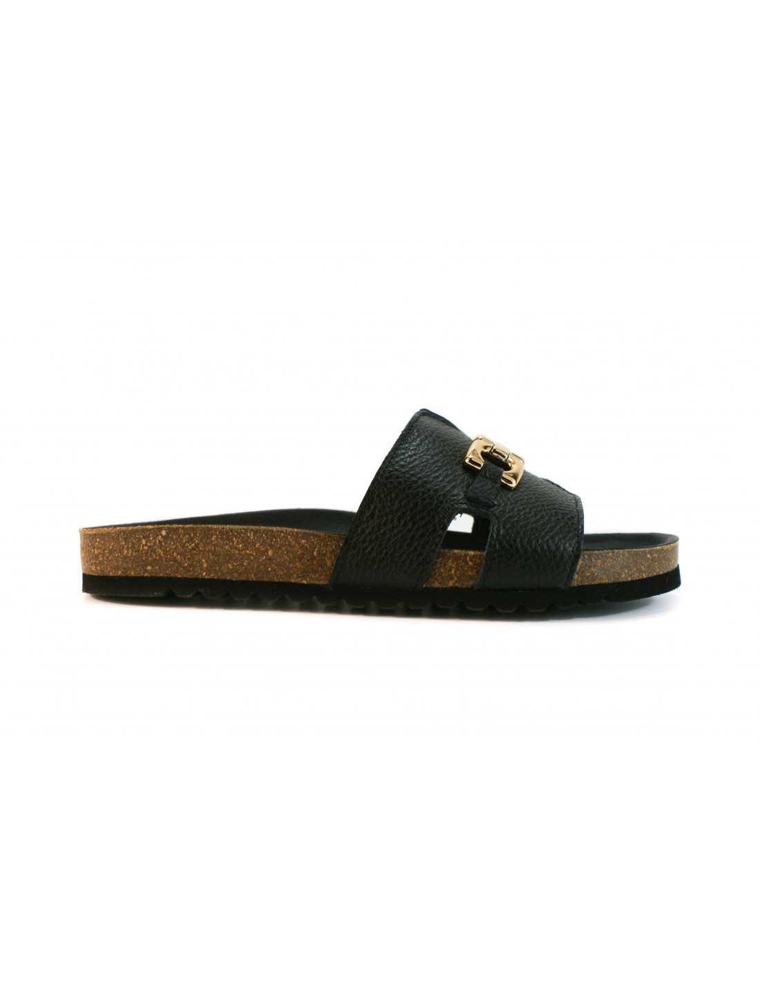 Bio sandal with an H-shaped upper and a gold metallic chain on the vamp. Made of black leather. Cushioned insole.