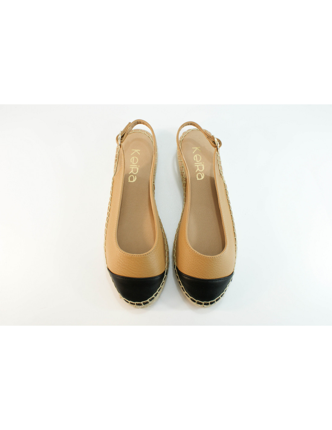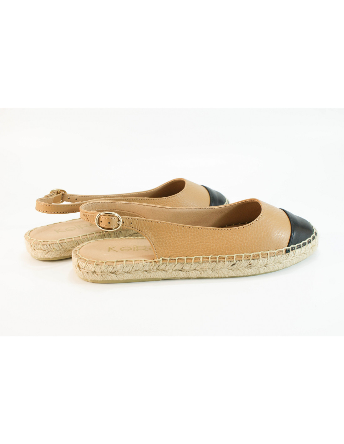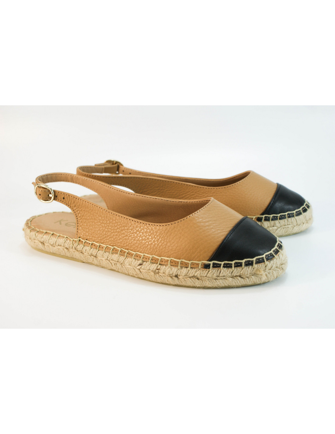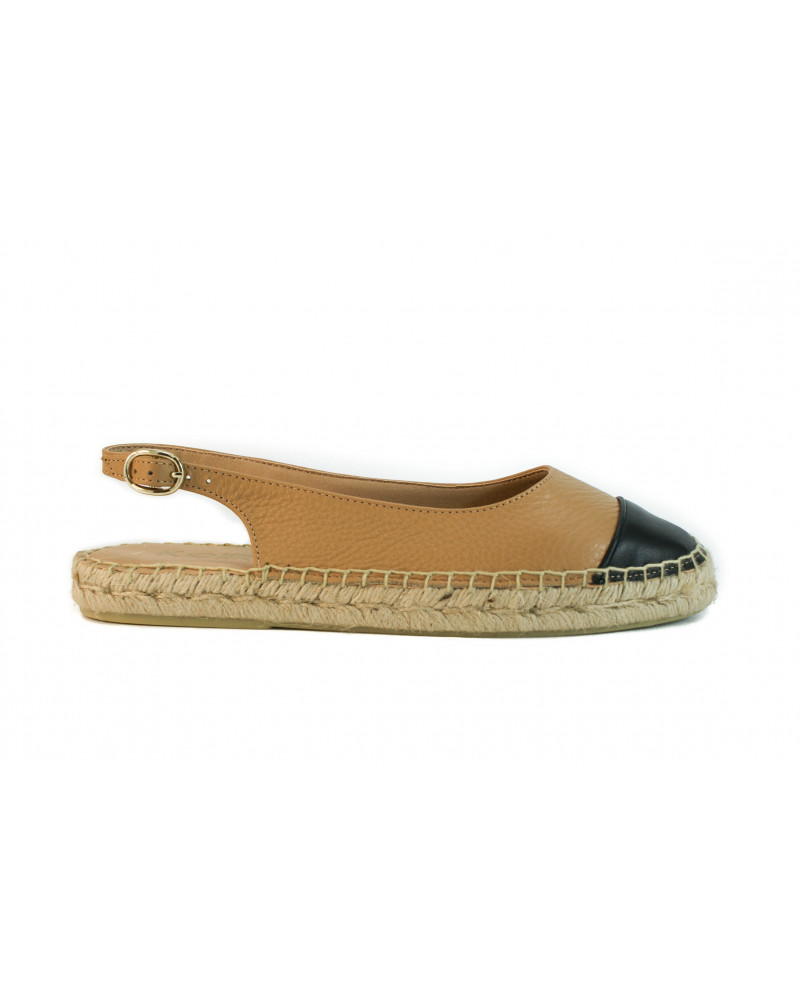 Espadrille with a two-string esparto sole, made in a combination of black and camel leather. Padded leather insole and rubber sole. Made in Spain. Available in more colors.