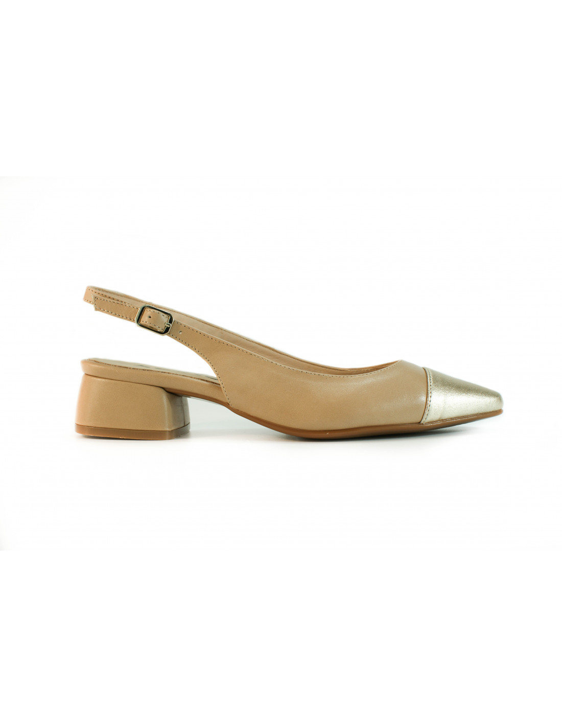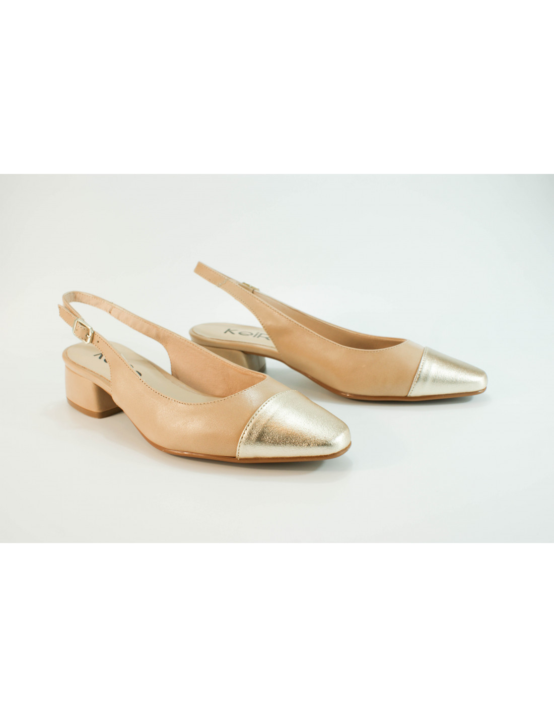 Open-toed pumps made of champagne and nude leather. Back strap with buckle closure. Leather lining and insole. Rubber sole. 4 cm heel.