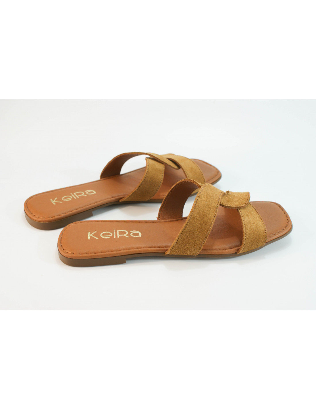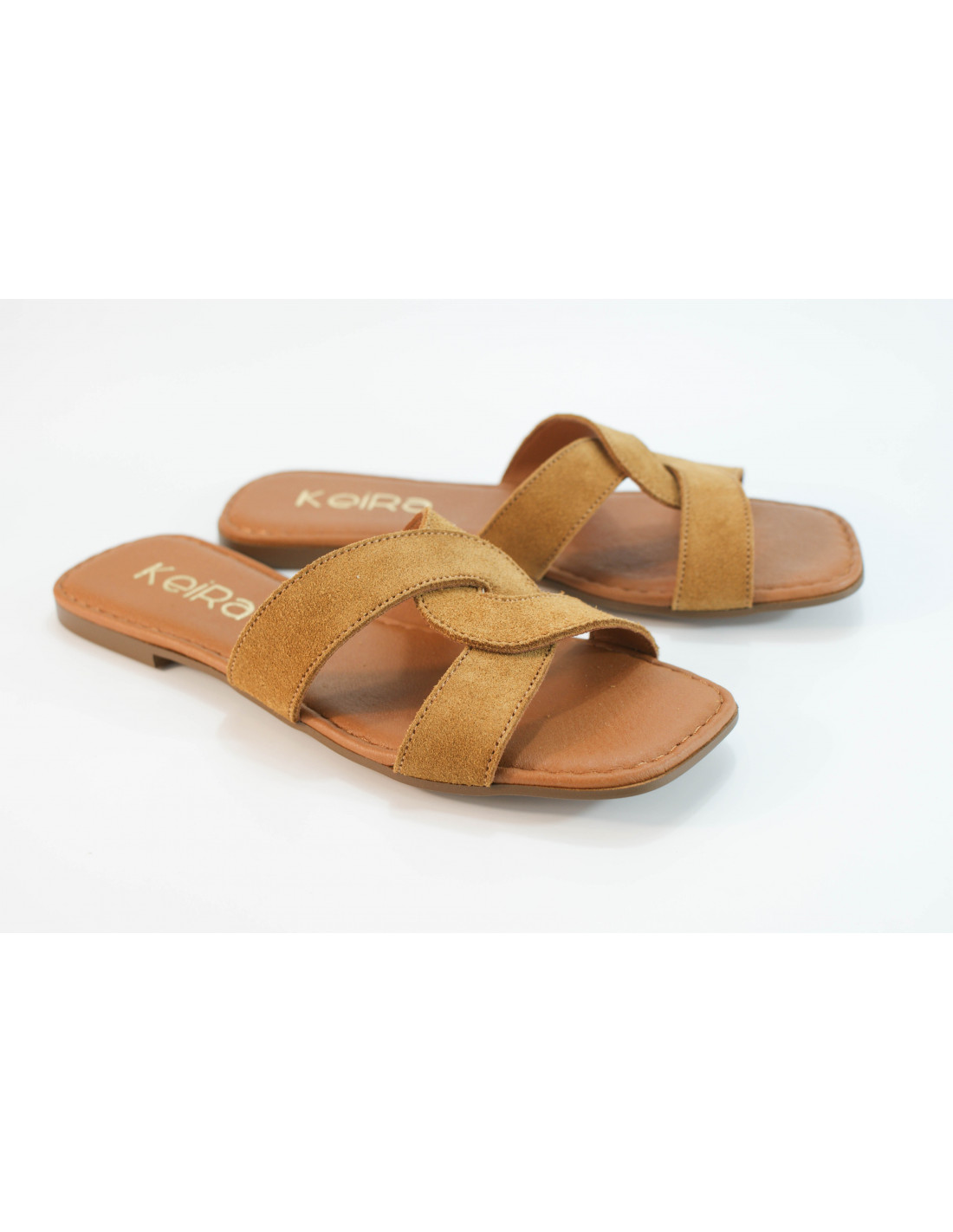 Flat sandal made of cognac suede leather. Cushioned insole.