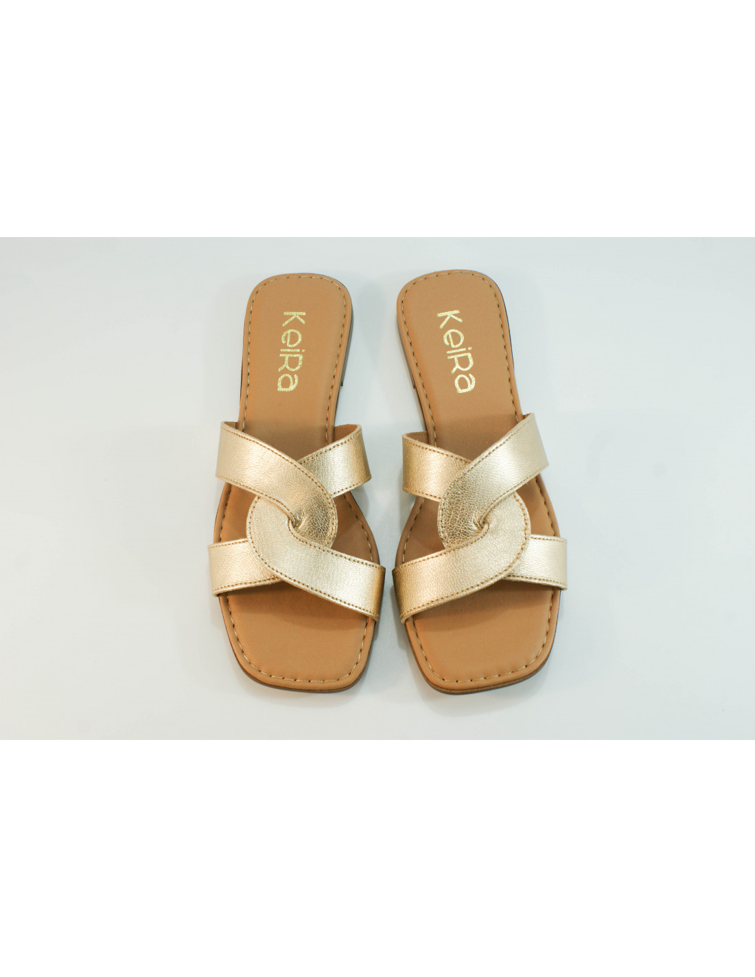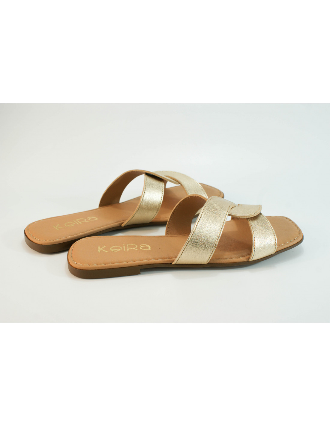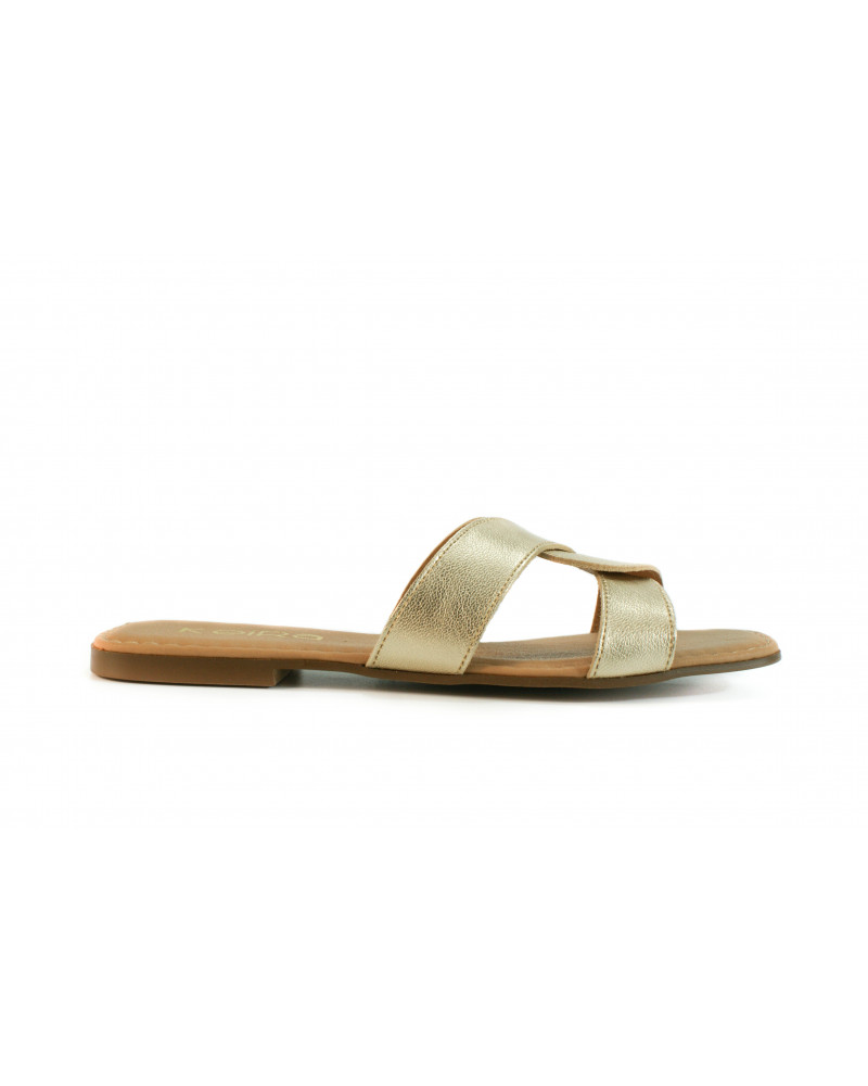Flat sandal made of champagne metallic leather. Cushioned insole.