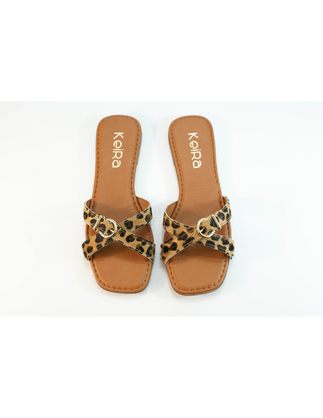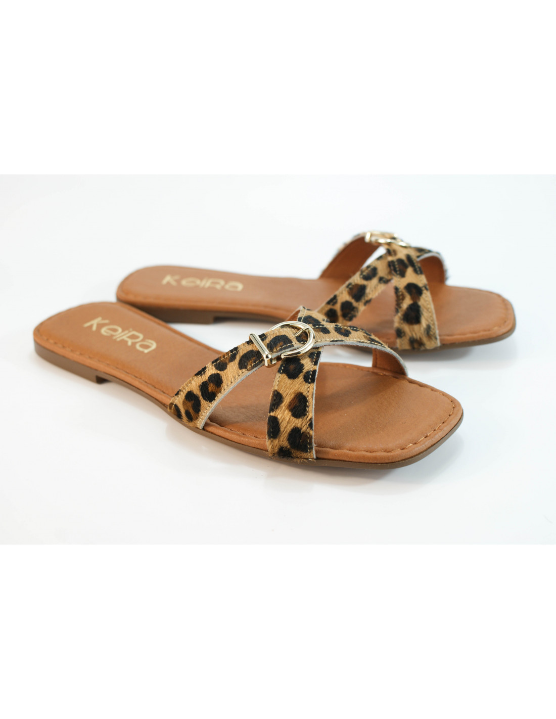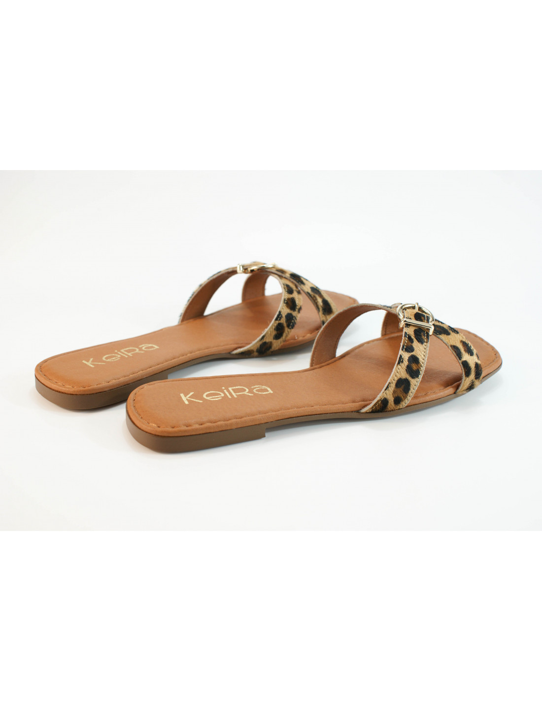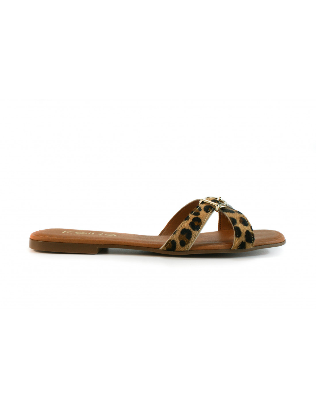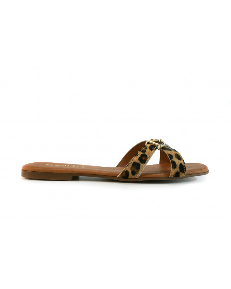 Flat sandal made of faux leopard pony leather with a gold buckle detail. Cushioned insole.