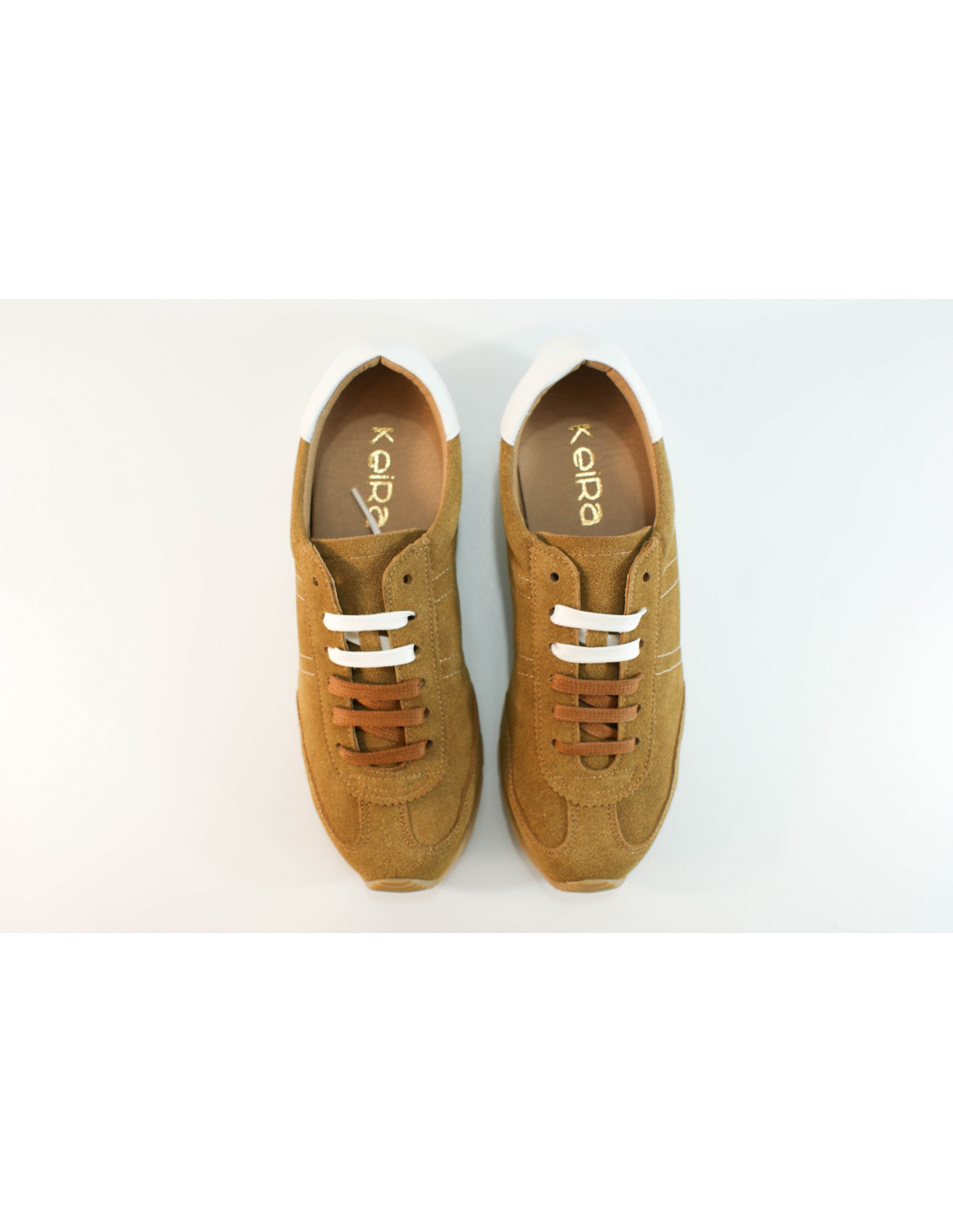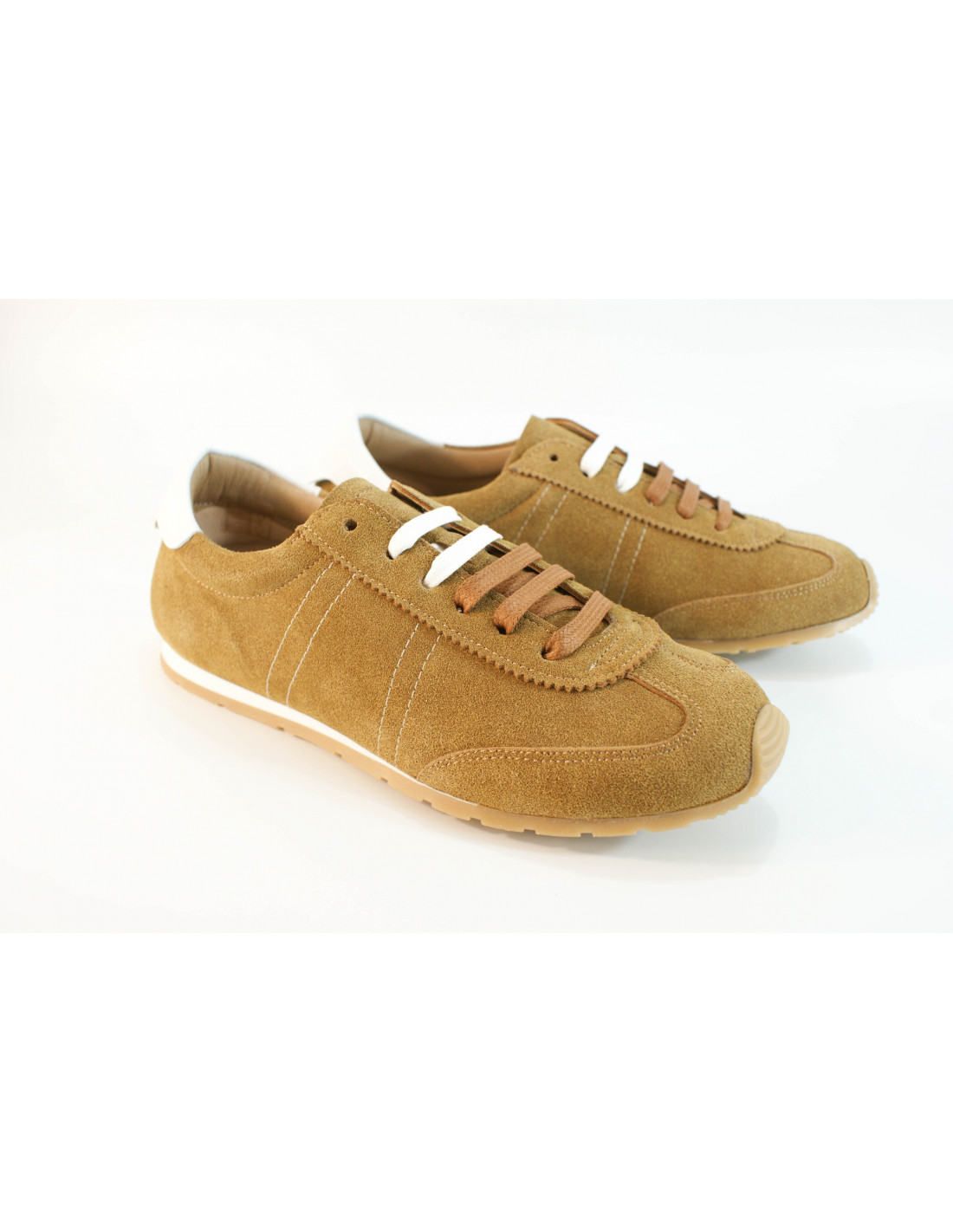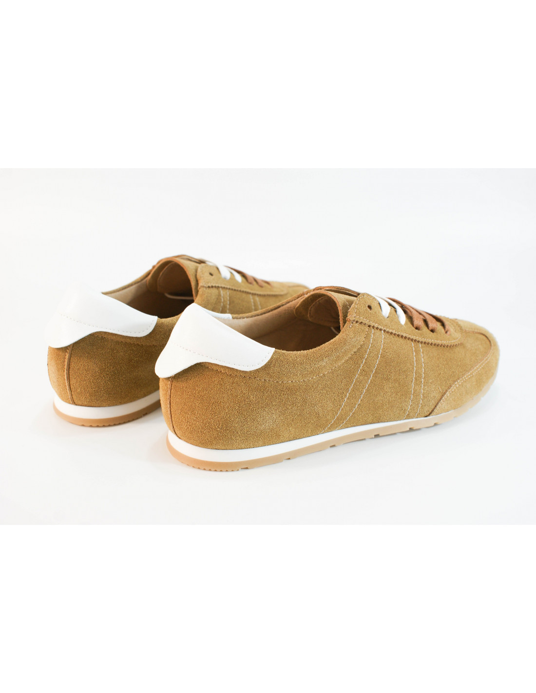 Sneaker made of leather in a tan color and white leather. Thin sole, leather lining and insole. Double two-tone laces.